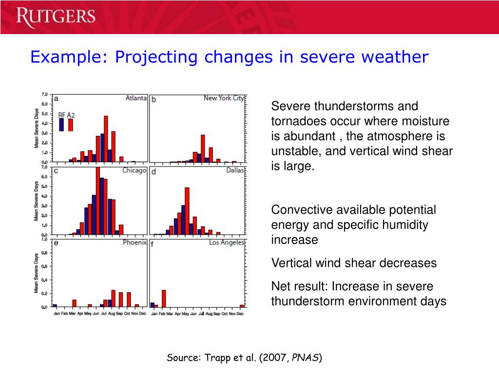 Example: Projecting changes in severe weather Severe thunderstorms and tornadoes occur where moisture is abundant , the atmosphere is unstable, and vertical wind shear is large. Convective available potential energy and specific humidity increase Vertical wind shear decreases Net result: Increase in severe thunderstorm environment days Source: Trapp et al. (2007, PNAS)