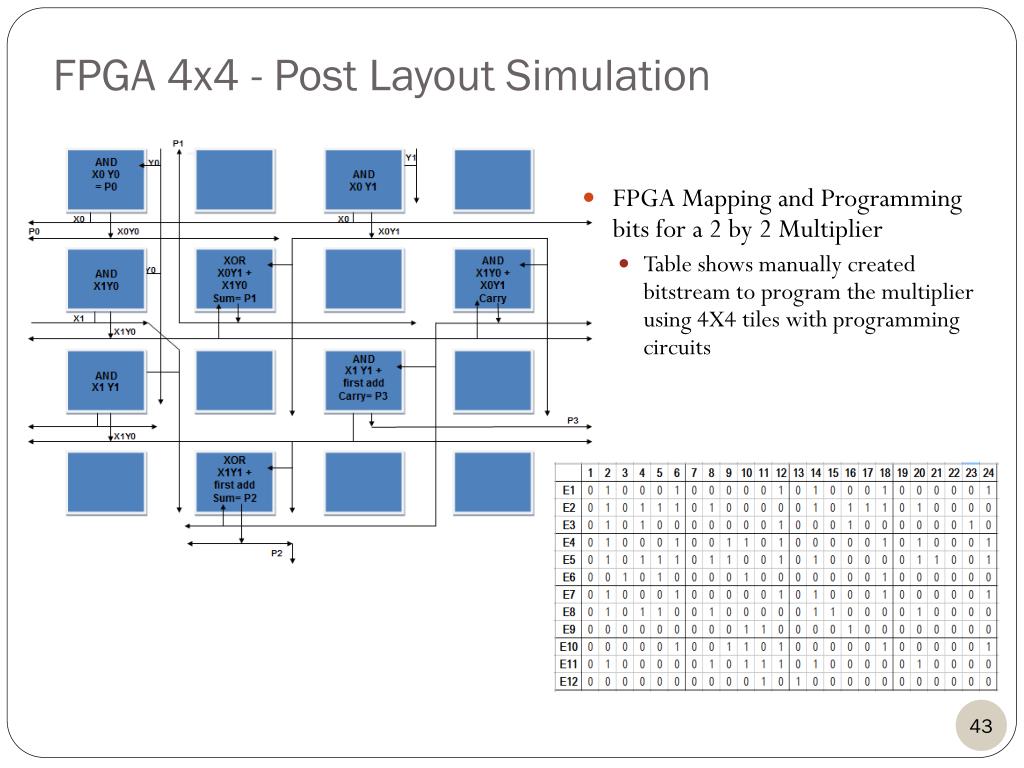 FPGA 4x4 - Post Layout Simulation • FPGA Mapping and Programming bits for a 2 by 2 Multiplier • Table shows manually created bitstream to program the multiplier using 4X4 tiles with programming circuits 43