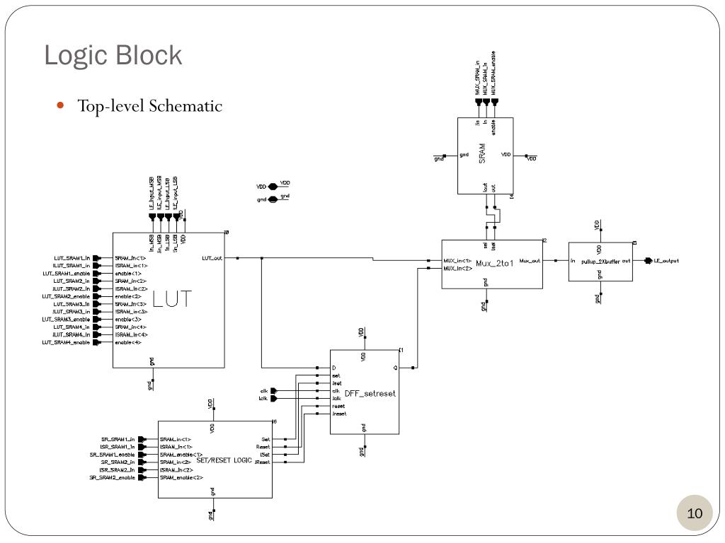Presentation Outline • Schematics • Base Cells – Pass transistor, SRAM, Multiplexer • Logic Block – LUT, Set/Reset Logic, D-flipflop • Connection Box – Right, Bottom • Switch Box • Tile 2X2 • Programming Circuitry – Row, Column • FPGA 4X4 – Programming a multiplier • FPGA 32X16 – full schematic • Layouts • Base Cells – SRAM, Multiplexer, Pull-up Buffer • Logic Block – LUT, Set/Reset Logic, D-flipflop • Connection Box – Right, Bottom • Programming Circuitry – Row, Column • Tile – Single tile, Tile 2X2 • FPGA 4X4 – Post-layout simulation of programmed multiplier • FPGA 32X16 – floor plan, full layout • Clock tree – H-tree implemented • Complete layout with Padframe • DRC, LVS Results • Employed layout techniques and Conclusions