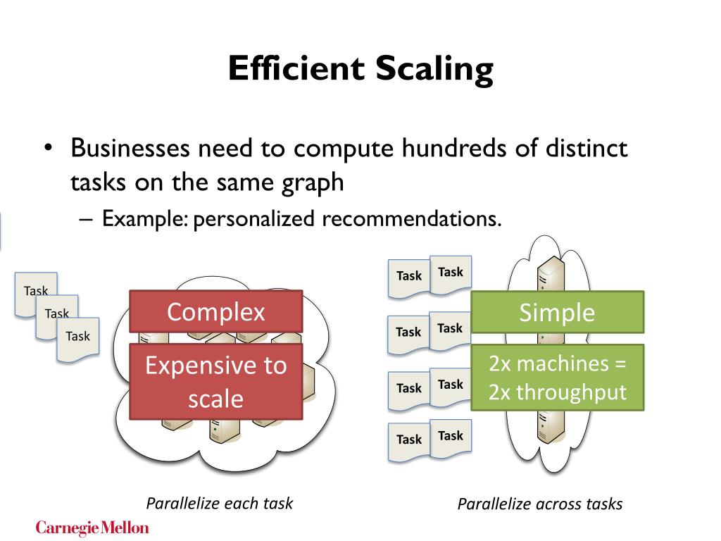 Efficient Scaling • Businesses need to compute hundreds of distinct tasks on the same graph • Example: personalized recommendations. Task Task Task Task Task Complex Simple Task Task Task Task Expensive to scale 2x machines = 2x throughput Task Task Task Task Parallelize each task Parallelize across tasks