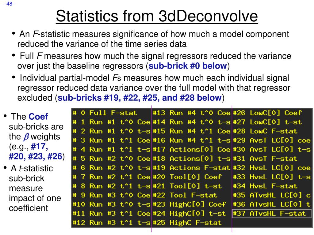 Statistics from 3dDeconvolve • An F-statistic measures significance of how much a model component reduced the variance of the time series data • Full F measures how much the signal regressors reduced the variance over just the baseline regressors (sub-brick #0 below) • Individual partial-model Fs measures how much each individual signal regressor reduced data variance over the full model with that regressor excluded (sub-bricks #19, #22, #25, and #28 below) • The Coef sub-bricks are the weights (e.g., #17, #20, #23, #26) • A t-statistic sub-brick measure impact of one coefficient