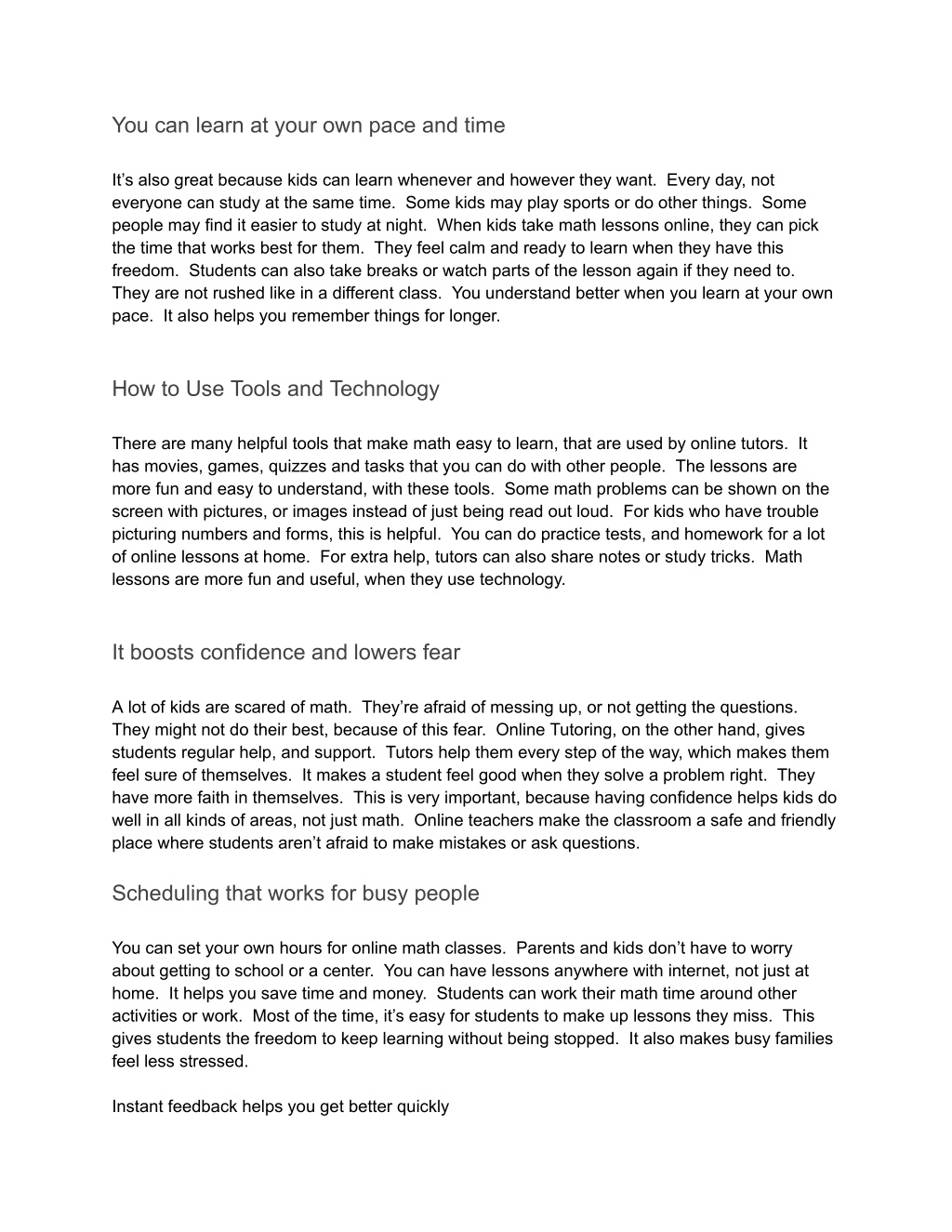 2. You can learn at your own pace and time It’s also great because kids can learn whenever and however they want. Every day, not everyone can study at the same time. Some kids may play sports or do other things. Some people may find it easier to study at night. When kids take math lessons online, they can pick the time that works best for them. They feel calm and ready to learn when they have this freedom. Students can also take breaks or watch parts of the lesson again if they need to. They are not rushed like in a different class. You understand better when you learn at your own pace. It also helps you remember things for longer. How to Use Tools and Technology There are many helpful tools that make math easy to learn, that are used by online tutors. It has movies, games, quizzes and tasks that you can do with other people. The lessons are more fun and easy to understand, with these tools. Some math problems can be shown on the screen with pictures, or images instead of just being read out loud. For kids who have trouble picturing numbers and forms, this is helpful. You can do practice tests, and homework for a lot of online lessons at home. For extra help, tutors can also share notes or study tricks. Math lessons are more fun and useful, when they use technology. It boosts confidence and lowers fear A lot of kids are scared of math. They’re afraid of messing up, or not getting the questions. They might not do their best, because of this fear. Online Tutoring, on the other hand, gives students regular help, and support. Tutors help them every step of the way, which makes them feel sure of themselves. It makes a student feel good when they solve a problem right. They have more faith in themselves. This is very important, because having confidence helps kids do well in all kinds of areas, not just math. Online teachers make the classroom a safe and friendly place where students aren’t afraid to make mistakes or ask questions. Scheduling that works for busy people You can set your own hours for online math classes. Parents and kids don’t have to worry about getting to school or a center. You can have lessons anywhere with internet, not just at home. It helps you save time and money. Students can work their math time around other activities or work. Most of the time, it’s easy for students to make up lessons they miss. This gives students the freedom to keep learning without being stopped. It also makes busy families feel less stressed. Instant feedback helps you get better quickly