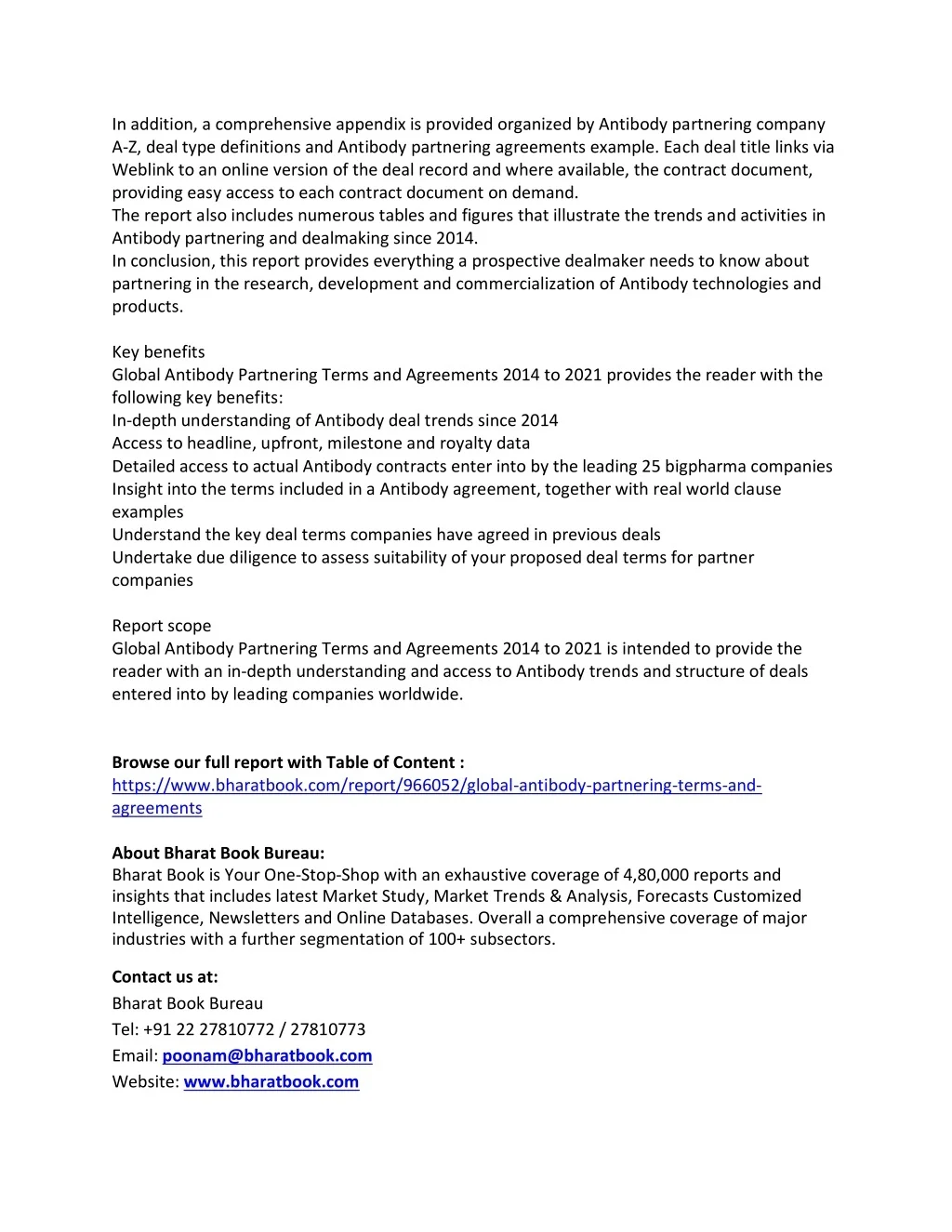 In addition, a comprehensive appendix is provided organized by Antibody partnering company A-Z, deal type definitions and Antibody partnering agreements example. Each deal title links via Weblink to an online version of the deal record and where available, the contract document, providing easy access to each contract document on demand. The report also includes numerous tables and figures that illustrate the trends and activities in Antibody partnering and dealmaking since 2014. In conclusion, this report provides everything a prospective dealmaker needs to know about partnering in the research, development and commercialization of Antibody technologies and products. Key benefits Global Antibody Partnering Terms and Agreements 2014 to 2021 provides the reader with the following key benefits: In-depth understanding of Antibody deal trends since 2014 Access to headline, upfront, milestone and royalty data Detailed access to actual Antibody contracts enter into by the leading 25 bigpharma companies Insight into the terms included in a Antibody agreement, together with real world clause examples Understand the key deal terms companies have agreed in previous deals Undertake due diligence to assess suitability of your proposed deal terms for partner companies Report scope Global Antibody Partnering Terms and Agreements 2014 to 2021 is intended to provide the reader with an in-depth understanding and access to Antibody trends and structure of deals entered into by leading companies worldwide. Browse our full report with Table of Content : https://www.bharatbook.com/report/966052/global-antibody-partnering-terms-and- agreements About Bharat Book Bureau: Bharat Book is Your One-Stop-Shop with an exhaustive coverage of 4,80,000 reports and insights that includes latest Market Study, Market Trends & Analysis, Forecasts Customized Intelligence, Newsletters and Online Databases. Overall a comprehensive coverage of major industries with a further segmentation of 100+ subsectors. Contact us at: Bharat Book Bureau Tel: +91 22 27810772 / 27810773 Email: poonam@bharatbook.com Website: www.bharatbook.com