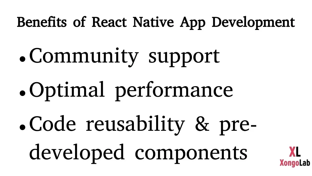 Benefits of React Native App Development • Community support • Optimal performance • Code reusability & pre-developed components • Cost-effective solution • Simplified UI • Third-party plugin support • Modular achitecture • Access to libraries and ready-made solutions