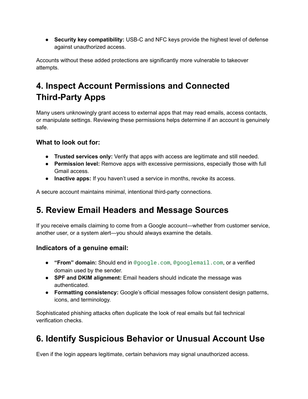 ● Security key compatibility: USB-C and NFC keys provide the highest level of defense against unauthorized access. Accounts without these added protections are significantly more vulnerable to takeover attempts. 4. Inspect Account Permissions and Connected Third-Party Apps Many users unknowingly grant access to external apps that may read emails, access contacts, or manipulate settings. Reviewing these permissions helps determine if an account is genuinely safe. What to look out for: ● Trusted services only: Verify that apps with access are legitimate and still needed. ● Permission level: Remove apps with excessive permissions, especially those with full Gmail access. ● Inactive apps: If you haven’t used a service in months, revoke its access. A secure account maintains minimal, intentional third-party connections. 5. Review Email Headers and Message Sources If you receive emails claiming to come from a Google account—whether from customer service, another user, or a system alert—you should always examine the details. Indicators of a genuine email: ● “From” domain: Should end in @google.com, @googlemail.com, or a verified domain used by the sender. ● SPF and DKIM alignment: Email headers should indicate the message was authenticated. ● Formatting consistency: Google’s official messages follow consistent design patterns, icons, and terminology. Sophisticated phishing attacks often duplicate the look of real emails but fail technical verification checks. 6. Identify Suspicious Behavior or Unusual Account Use Even if the login appears legitimate, certain behaviors may signal unauthorized access.