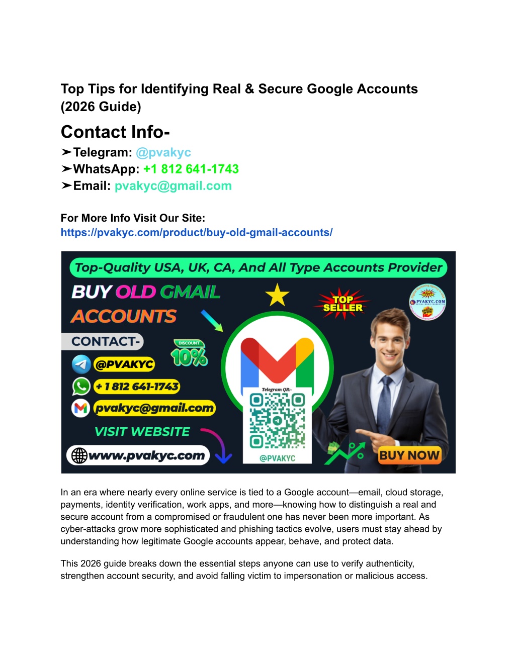 Top Tips for Identifying Real & Secure Google Accounts (2026 Guide) Contact Info- ➤Telegram: @pvakyc ➤WhatsApp: +1 812 641-1743 ➤Email: pvakyc@gmail.com For More Info Visit Our Site: https://pvakyc.com/product/buy-old-gmail-accounts/ In an era where nearly every online service is tied to a Google account—email, cloud storage, payments, identity verification, work apps, and more—knowing how to distinguish a real and secure account from a compromised or fraudulent one has never been more important. As cyber-attacks grow more sophisticated and phishing tactics evolve, users must stay ahead by understanding how legitimate Google accounts appear, behave, and protect data. This 2026 guide breaks down the essential steps anyone can use to verify authenticity, strengthen account security, and avoid falling victim to impersonation or malicious access.
