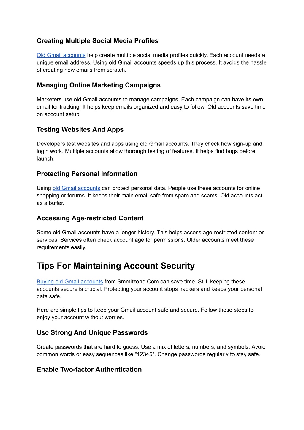 Creating Multiple Social Media Profiles Old Gmail accounts help create multiple social media profiles quickly. Each account needs a unique email address. Using old Gmail accounts speeds up this process. It avoids the hassle of creating new emails from scratch. Managing Online Marketing Campaigns Marketers use old Gmail accounts to manage campaigns. Each campaign can have its own email for tracking. It helps keep emails organized and easy to follow. Old accounts save time on account setup. Testing Websites And Apps Developers test websites and apps using old Gmail accounts. They check how sign-up and login work. Multiple accounts allow thorough testing of features. It helps find bugs before launch. Protecting Personal Information Using old Gmail accounts can protect personal data. People use these accounts for online shopping or forums. It keeps their main email safe from spam and scams. Old accounts act as a buffer. Accessing Age-restricted Content Some old Gmail accounts have a longer history. This helps access age-restricted content or services. Services often check account age for permissions. Older accounts meet these requirements easily. Tips For Maintaining Account Security Buying old Gmail accounts from Smmitzone.Com can save time. Still, keeping these accounts secure is crucial. Protecting your account stops hackers and keeps your personal data safe. Here are simple tips to keep your Gmail account safe and secure. Follow these steps to enjoy your account without worries. Use Strong And Unique Passwords Create passwords that are hard to guess. Use a mix of letters, numbers, and symbols. Avoid common words or easy sequences like "12345". Change passwords regularly to stay safe. Enable Two-factor Authentication