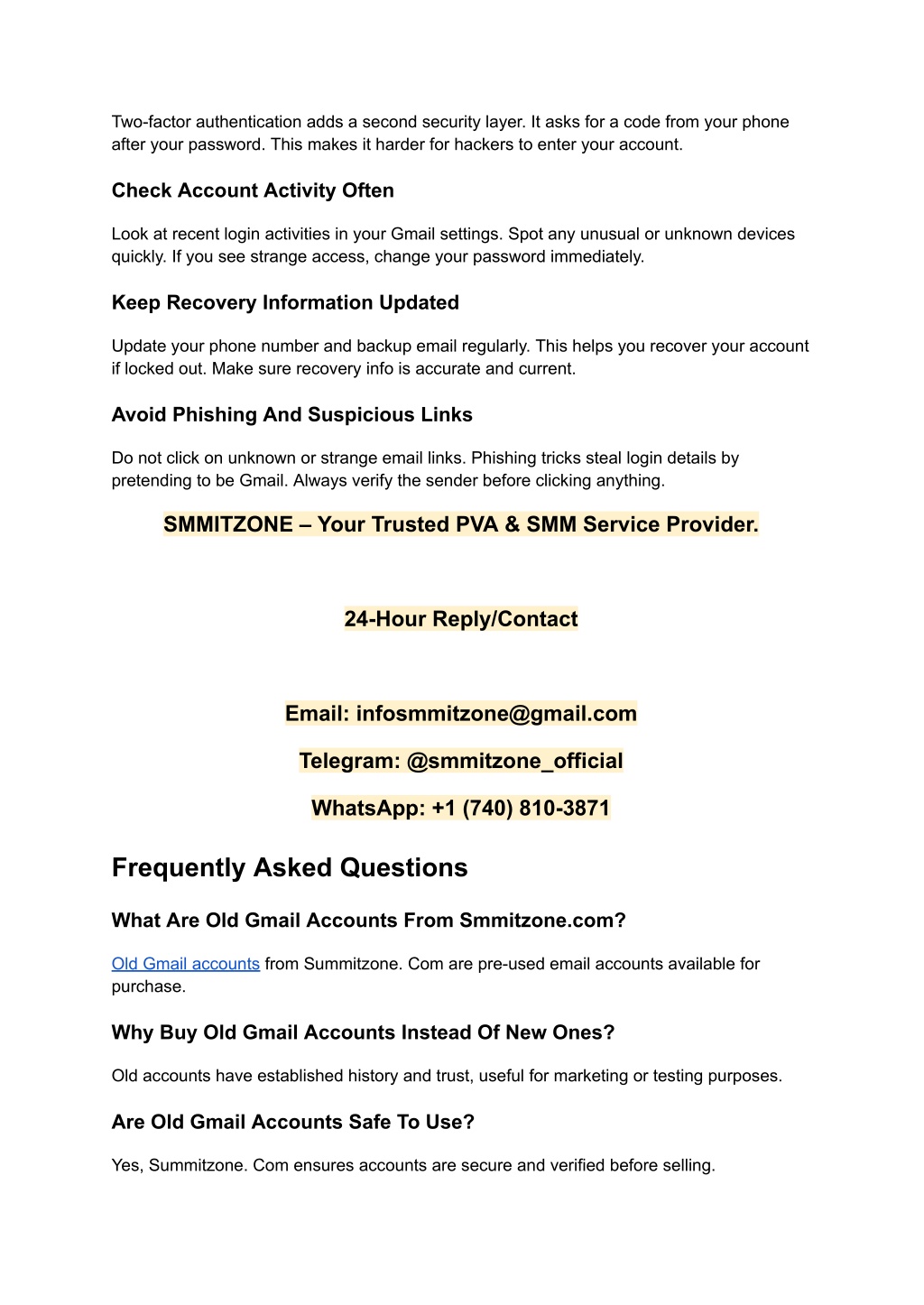 Two-factor authentication adds a second security layer. It asks for a code from your phone after your password. This makes it harder for hackers to enter your account. Check Account Activity Often Look at recent login activities in your Gmail settings. Spot any unusual or unknown devices quickly. If you see strange access, change your password immediately. Keep Recovery Information Updated Update your phone number and backup email regularly. This helps you recover your account if locked out. Make sure recovery info is accurate and current. Avoid Phishing And Suspicious Links Do not click on unknown or strange email links. Phishing tricks steal login details by pretending to be Gmail. Always verify the sender before clicking anything. SMMITZONE – Your Trusted PVA & SMM Service Provider. 24-Hour Reply/Contact Email: infosmmitzone@gmail.com Telegram: @smmitzone_official WhatsApp: +1 (740) 810-3871 Frequently Asked Questions What Are Old Gmail Accounts From Smmitzone.com? Old Gmail accounts from Summitzone. Com are pre-used email accounts available for purchase. Why Buy Old Gmail Accounts Instead Of New Ones? Old accounts have established history and trust, useful for marketing or testing purposes. Are Old Gmail Accounts Safe To Use? Yes, Summitzone. Com ensures accounts are secure and verified before selling.