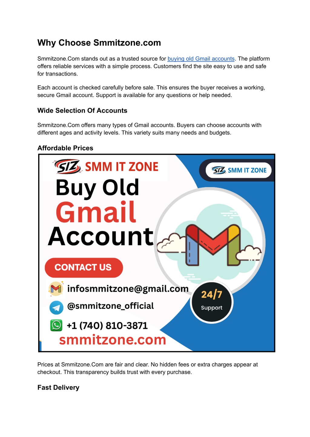 Why Choose Smmitzone.com Smmitzone.Com stands out as a trusted source for buying old Gmail accounts. The platform offers reliable services with a simple process. Customers find the site easy to use and safe for transactions. Each account is checked carefully before sale. This ensures the buyer receives a working, secure Gmail account. Support is available for any questions or help needed. Wide Selection Of Accounts Smmitzone.Com offers many types of Gmail accounts. Buyers can choose accounts with different ages and activity levels. This variety suits many needs and budgets. Affordable Prices Prices at Smmitzone.Com are fair and clear. No hidden fees or extra charges appear at checkout. This transparency builds trust with every purchase. Fast Delivery