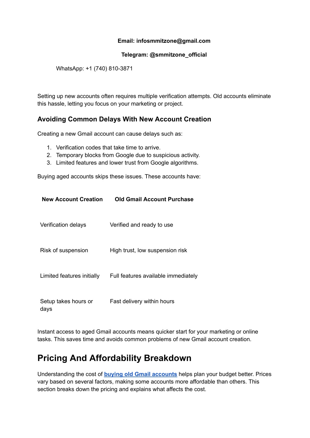 Email: infosmmitzone@gmail.com Telegram: @smmitzone_official WhatsApp: +1 (740) 810-3871 Setting up new accounts often requires multiple verification attempts. Old accounts eliminate this hassle, letting you focus on your marketing or project. Avoiding Common Delays With New Account Creation Creating a new Gmail account can cause delays such as: 1. Verification codes that take time to arrive. 2. Temporary blocks from Google due to suspicious activity. 3. Limited features and lower trust from Google algorithms. Buying aged accounts skips these issues. These accounts have: New Account Creation Old Gmail Account Purchase Verification delays Verified and ready to use Risk of suspension High trust, low suspension risk Limited features initially Full features available immediately Setup takes hours or days Fast delivery within hours Instant access to aged Gmail accounts means quicker start for your marketing or online tasks. This saves time and avoids common problems of new Gmail account creation. Pricing And Affordability Breakdown Understanding the cost of buying old Gmail accounts helps plan your budget better. Prices vary based on several factors, making some accounts more affordable than others. This section breaks down the pricing and explains what affects the cost.