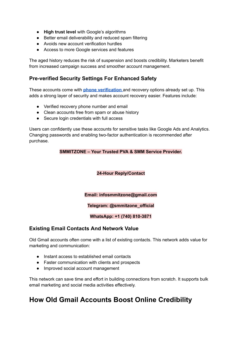● High trust level with Google’s algorithms ● Better email deliverability and reduced spam filtering ● Avoids new account verification hurdles ● Access to more Google services and features The aged history reduces the risk of suspension and boosts credibility. Marketers benefit from increased campaign success and smoother account management. Pre-verified Security Settings For Enhanced Safety These accounts come with phone verificationand recovery options already set up. This adds a strong layer of security and makes account recovery easier. Features include: ● Verified recovery phone number and email ● Clean accounts free from spam or abuse history ● Secure login credentials with full access Users can confidently use these accounts for sensitive tasks like Google Ads and Analytics. Changing passwords and enabling two-factor authentication is recommended after purchase. SMMITZONE – Your Trusted PVA & SMM Service Provider. 24-Hour Reply/Contact Email: infosmmitzone@gmail.com Telegram: @smmitzone_official WhatsApp: +1 (740) 810-3871 Existing Email Contacts And Network Value Old Gmail accounts often come with a list of existing contacts. This network adds value for marketing and communication: ● Instant access to established email contacts ● Faster communication with clients and prospects ● Improved social account management This network can save time and effort in building connections from scratch. It supports bulk email marketing and social media activities effectively. How Old Gmail Accounts Boost Online Credibility