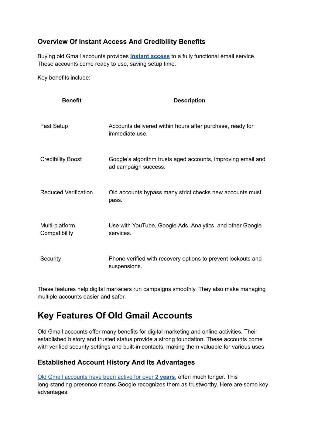 Overview Of Instant Access And Credibility Benefits Buying old Gmail accounts provides instant access to a fully functional email service. These accounts come ready to use, saving setup time. Key benefits include: Benefit Description Fast Setup Accounts delivered within hours after purchase, ready for immediate use. Credibility Boost Google’s algorithm trusts aged accounts, improving email and ad campaign success. Reduced Verification Old accounts bypass many strict checks new accounts must pass. Multi-platform Compatibility Use with YouTube, Google Ads, Analytics, and other Google services. Security Phone verified with recovery options to prevent lockouts and suspensions. These features help digital marketers run campaigns smoothly. They also make managing multiple accounts easier and safer. Key Features Of Old Gmail Accounts Old Gmail accounts offer many benefits for digital marketing and online activities. Their established history and trusted status provide a strong foundation. These accounts come with verified security settings and built-in contacts, making them valuable for various uses Established Account History And Its Advantages Old Gmail accounts have been active for over 2 years, often much longer. This long-standing presence means Google recognizes them as trustworthy. Here are some key advantages:
