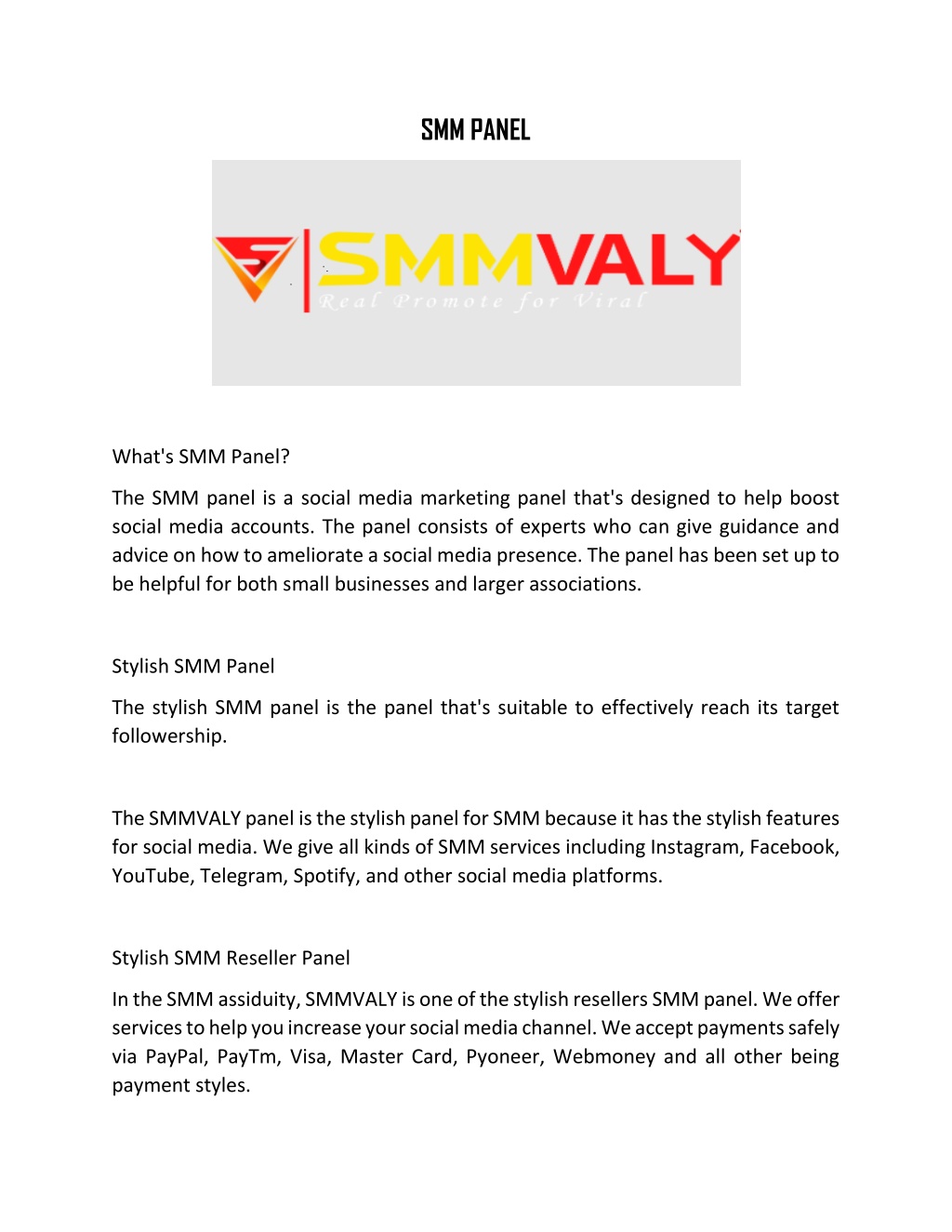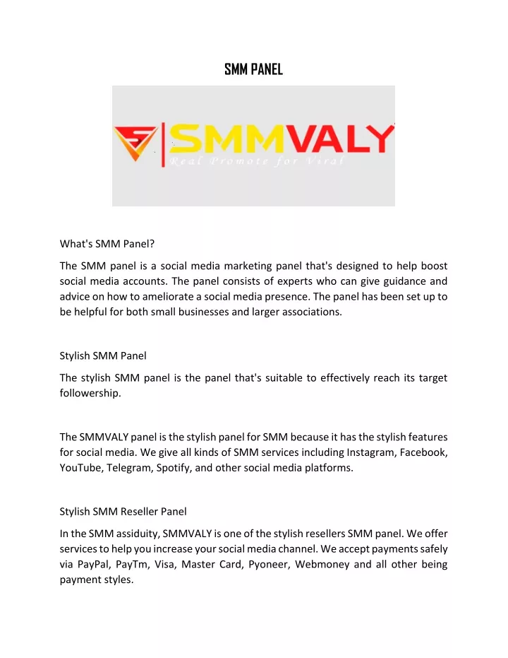 SMM PANEL What's SMM Panel? The SMM panel is a social media marketing panel that's designed to help boost social media accounts. The panel consists of experts who can give guidance and advice on how to ameliorate a social media presence. The panel has been set up to be helpful for both small businesses and larger associations. Stylish SMM Panel The stylish SMM panel is the panel that's suitable to effectively reach its target followership. The SMMVALY panel is the stylish panel for SMM because it has the stylish features for social media. We give all kinds of SMM services including Instagram, Facebook, YouTube, Telegram, Spotify, and other social media platforms. Stylish SMM Reseller Panel In the SMM assiduity, SMMVALY is one of the stylish resellers SMM panel. We offer services to help you increase your social media channel. We accept payments safely via PayPal, PayTm, Visa, Master Card, Pyoneer, Webmoney and all other being payment styles.