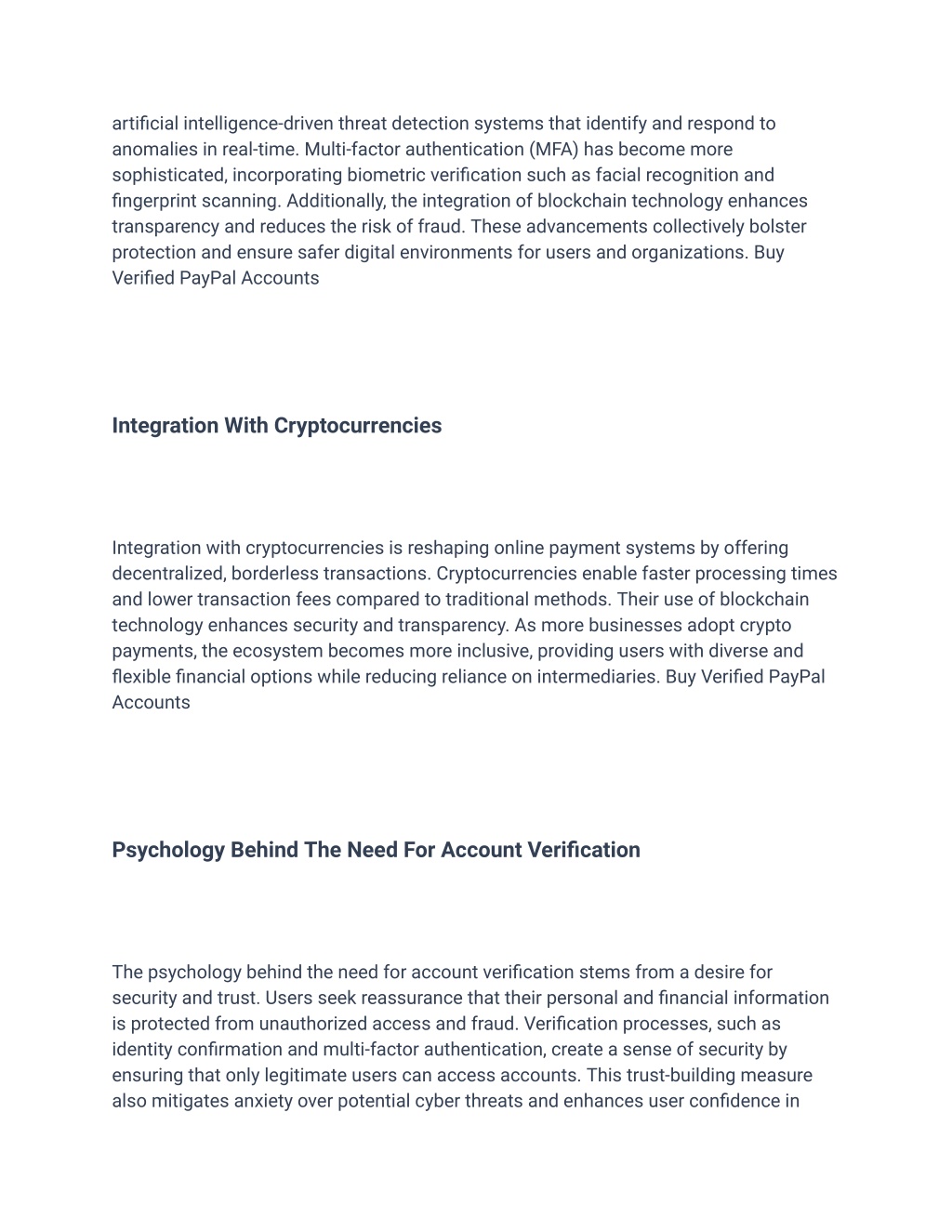 artificial intelligence-driven threat detection systems that identify and respond to anomalies in real-time. Multi-factor authentication (MFA) has become more sophisticated, incorporating biometric verification such as facial recognition and fingerprint scanning. Additionally, the integration of blockchain technology enhances transparency and reduces the risk of fraud. These advancements collectively bolster protection and ensure safer digital environments for users and organizations. Buy Verified PayPal Accounts Integration With Cryptocurrencies Integration with cryptocurrencies is reshaping online payment systems by offering decentralized, borderless transactions. Cryptocurrencies enable faster processing times and lower transaction fees compared to traditional methods. Their use of blockchain technology enhances security and transparency. As more businesses adopt crypto payments, the ecosystem becomes more inclusive, providing users with diverse and flexible financial options while reducing reliance on intermediaries. Buy Verified PayPal Accounts Psychology Behind The Need For Account Verification The psychology behind the need for account verification stems from a desire for security and trust. Users seek reassurance that their personal and financial information is protected from unauthorized access and fraud. Verification processes, such as identity confirmation and multi-factor authentication, create a sense of security by ensuring that only legitimate users can access accounts. This trust-building measure also mitigates anxiety over potential cyber threats and enhances user confidence in