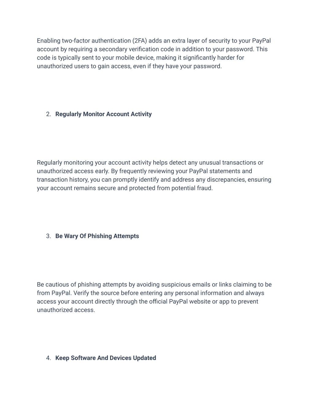 Enabling two-factor authentication (2FA) adds an extra layer of security to your PayPal account by requiring a secondary verification code in addition to your password. This code is typically sent to your mobile device, making it significantly harder for unauthorized users to gain access, even if they have your password. 2. Regularly Monitor Account Activity Regularly monitoring your account activity helps detect any unusual transactions or unauthorized access early. By frequently reviewing your PayPal statements and transaction history, you can promptly identify and address any discrepancies, ensuring your account remains secure and protected from potential fraud. 3. Be Wary Of Phishing Attempts Be cautious of phishing attempts by avoiding suspicious emails or links claiming to be from PayPal. Verify the source before entering any personal information and always access your account directly through the official PayPal website or app to prevent unauthorized access. 4. Keep Software And Devices Updated