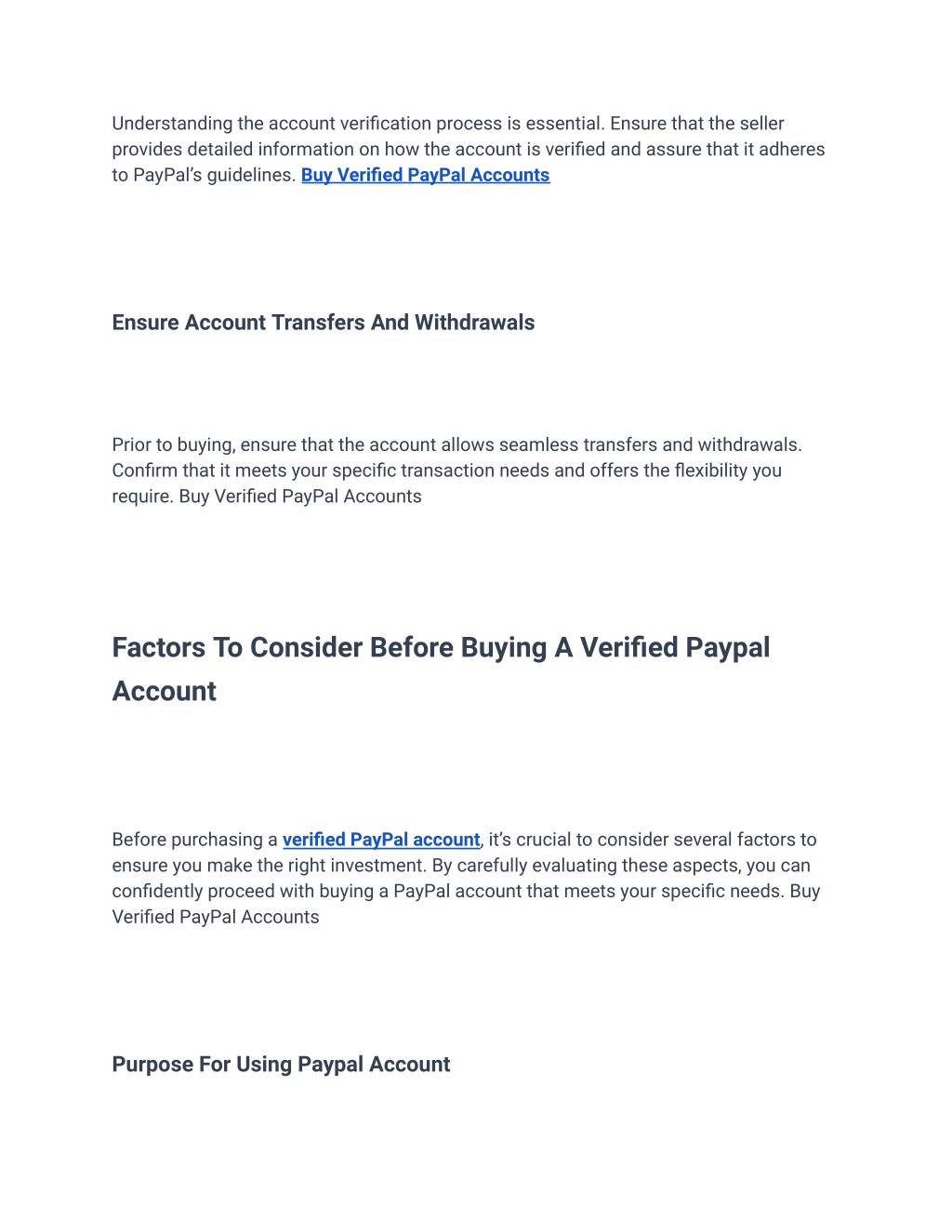 Understanding the account verification process is essential. Ensure that the seller provides detailed information on how the account is verified and assure that it adheres to PayPal’s guidelines. Buy Verified PayPal Accounts Ensure Account Transfers And Withdrawals Prior to buying, ensure that the account allows seamless transfers and withdrawals. Confirm that it meets your specific transaction needs and offers the flexibility you require. Buy Verified PayPal Accounts Factors To Consider Before Buying A Verified Paypal Account Before purchasing a verified PayPal account, it’s crucial to consider several factors to ensure you make the right investment. By carefully evaluating these aspects, you can confidently proceed with buying a PayPal account that meets your specific needs. Buy Verified PayPal Accounts Purpose For Using Paypal Account