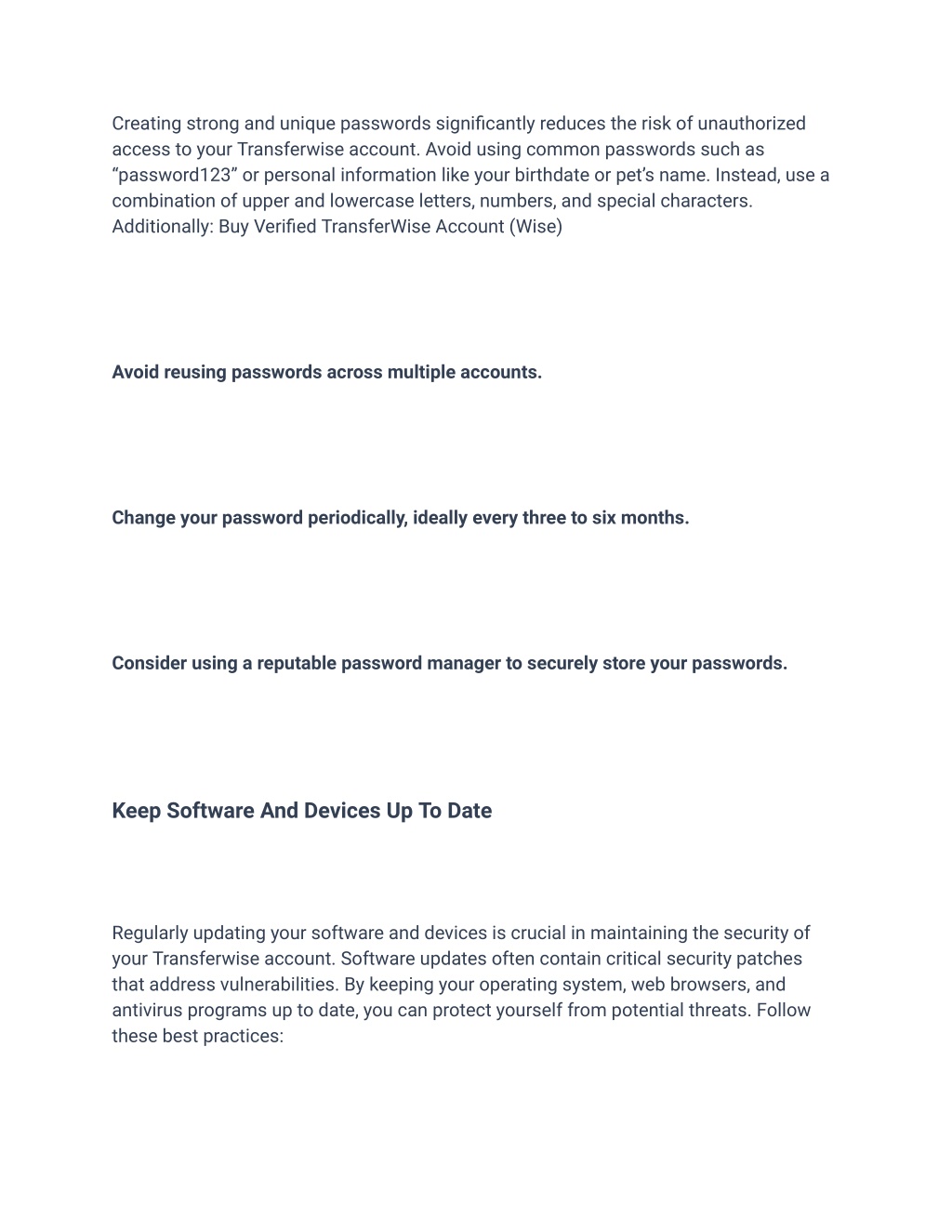 Creating strong and unique passwords significantly reduces the risk of unauthorized access to your Transferwise account. Avoid using common passwords such as “password123” or personal information like your birthdate or pet’s name. Instead, use a combination of upper and lowercase letters, numbers, and special characters. Additionally: Buy Verified TransferWise Account (Wise) Avoid reusing passwords across multiple accounts. Change your password periodically, ideally every three to six months. Consider using a reputable password manager to securely store your passwords. Keep Software And Devices Up To Date Regularly updating your software and devices is crucial in maintaining the security of your Transferwise account. Software updates often contain critical security patches that address vulnerabilities. By keeping your operating system, web browsers, and antivirus programs up to date, you can protect yourself from potential threats. Follow these best practices: