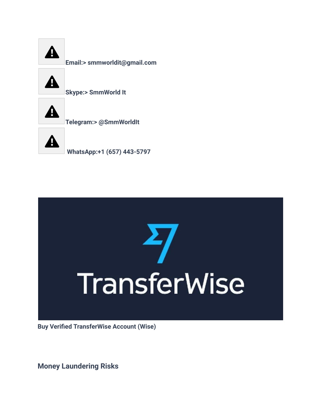 Email:> smmworldit@gmail.com Skype:> SmmWorld It Telegram:> @SmmWorldIt WhatsApp:+1 (657) 443-5797 Buy Verified TransferWise Account (Wise) Money Laundering Risks