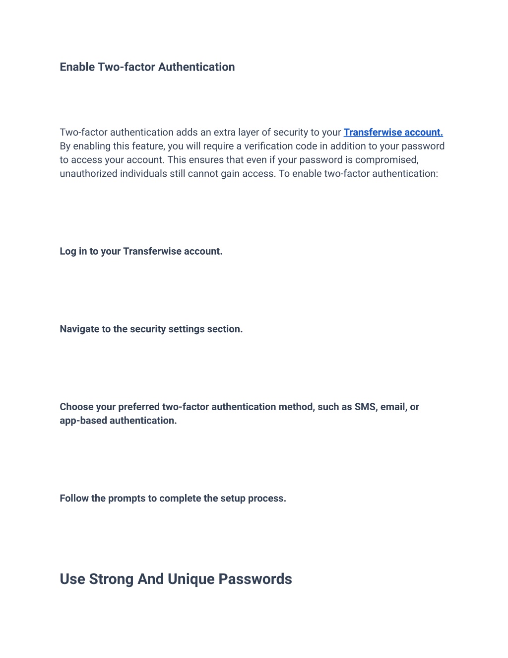 Enable Two-factor Authentication Two-factor authentication adds an extra layer of security to your Transferwise account. By enabling this feature, you will require a verification code in addition to your password to access your account. This ensures that even if your password is compromised, unauthorized individuals still cannot gain access. To enable two-factor authentication: Log in to your Transferwise account. Navigate to the security settings section. Choose your preferred two-factor authentication method, such as SMS, email, or app-based authentication. Follow the prompts to complete the setup process. Use Strong And Unique Passwords
