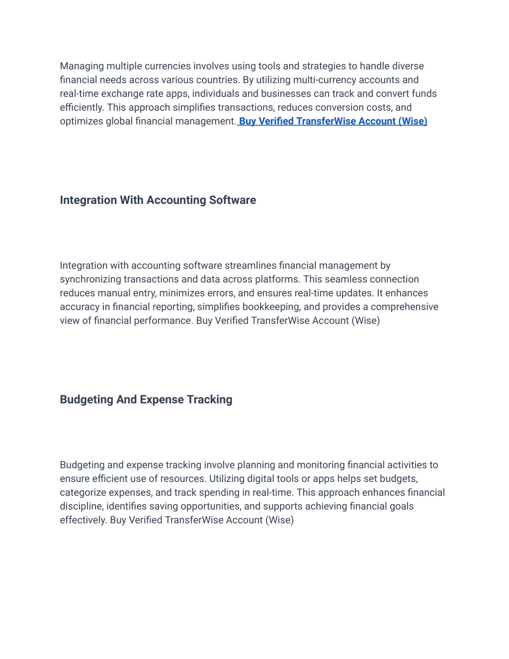 Managing multiple currencies involves using tools and strategies to handle diverse financial needs across various countries. By utilizing multi-currency accounts and real-time exchange rate apps, individuals and businesses can track and convert funds efficiently. This approach simplifies transactions, reduces conversion costs, and optimizes global financial management. Buy Verified TransferWise Account (Wise) Integration With Accounting Software Integration with accounting software streamlines financial management by synchronizing transactions and data across platforms. This seamless connection reduces manual entry, minimizes errors, and ensures real-time updates. It enhances accuracy in financial reporting, simplifies bookkeeping, and provides a comprehensive view of financial performance. Buy Verified TransferWise Account (Wise) Budgeting And Expense Tracking Budgeting and expense tracking involve planning and monitoring financial activities to ensure efficient use of resources. Utilizing digital tools or apps helps set budgets, categorize expenses, and track spending in real-time. This approach enhances financial discipline, identifies saving opportunities, and supports achieving financial goals effectively. Buy Verified TransferWise Account (Wise)