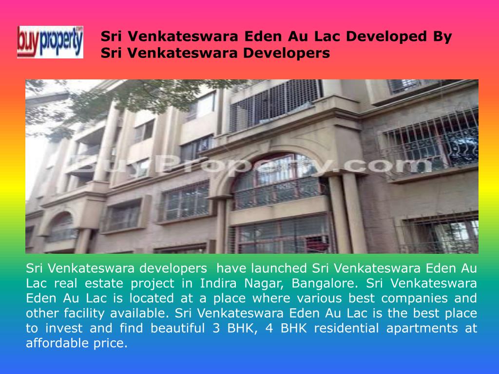 Sri Venkateswara Eden Au Lac Developed By Sri Venkateswara Developers Sri Venkateswara developers have launched Sri Venkateswara Eden Au Lac real estate project in Indira Nagar, Bangalore. Sri Venkateswara Eden Au Lac is located at a place where various best companies and other facility available. Sri Venkateswara Eden Au Lac is the best place to invest and find beautiful 3 BHK, 4 BHK residential apartments at affordable price.