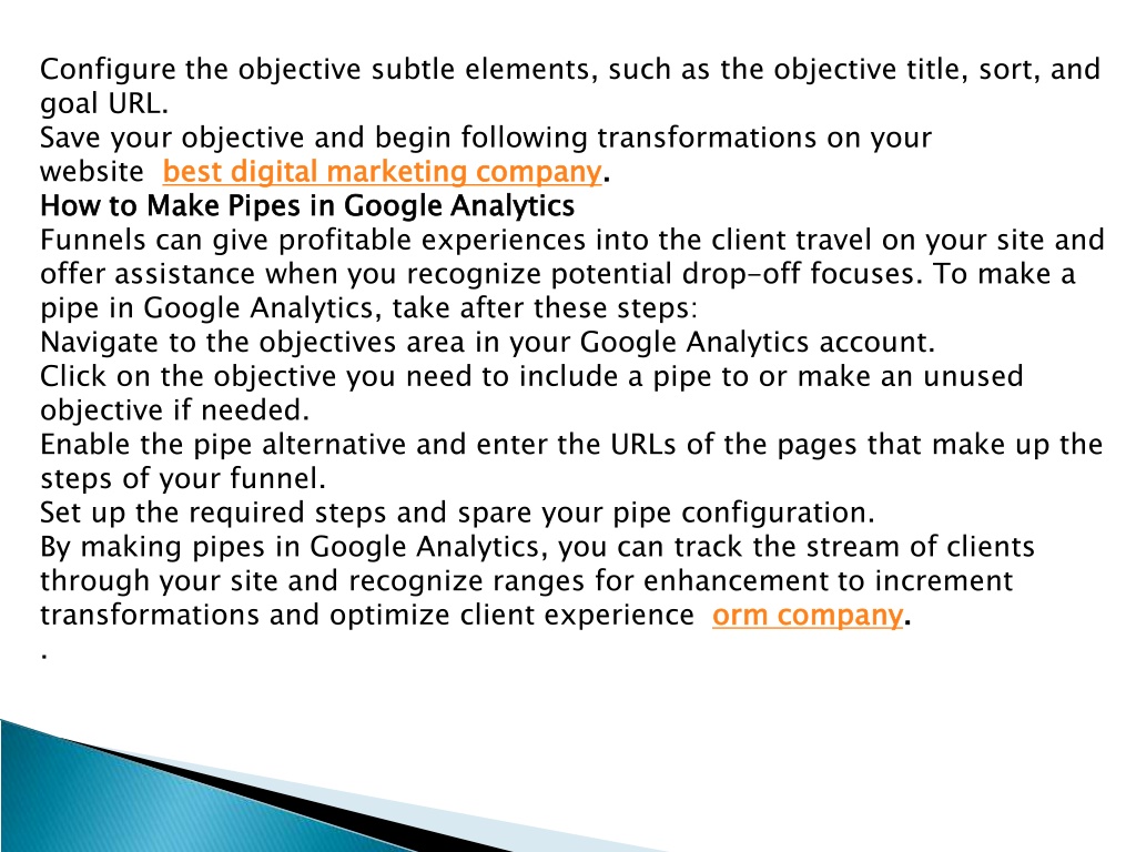 Configure the objective subtle elements, such as the objective title, sort, and goal URL. Save your objective and begin following transformations on your website best digital marketing company How to Make Pipes in Google Analytics Funnels can give profitable experiences into the client travel on your site and offer assistance when you recognize potential drop-off focuses. To make a pipe in Google Analytics, take after these steps: Navigate to the objectives area in your Google Analytics account. Click on the objective you need to include a pipe to or make an unused objective if needed. Enable the pipe alternative and enter the URLs of the pages that make up the steps of your funnel. Set up the required steps and spare your pipe configuration. By making pipes in Google Analytics, you can track the stream of clients through your site and recognize ranges for enhancement to increment transformations and optimize client experience orm . best digital marketing company. . How to Make Pipes in Google Analytics orm company company. .