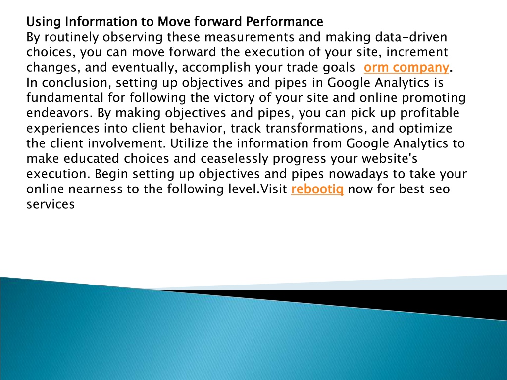 Using Information to Move forward Performance By routinely observing these measurements and making data-driven choices, you can move forward the execution of your site, increment changes, and eventually, accomplish your trade goals orm In conclusion, setting up objectives and pipes in Google Analytics is fundamental for following the victory of your site and online promoting endeavors. By making objectives and pipes, you can pick up profitable experiences into client behavior, track transformations, and optimize the client involvement. Utilize the information from Google Analytics to make educated choices and ceaselessly progress your website's execution. Begin setting up objectives and pipes nowadays to take your online nearness to the following level.Visit rebootiq services Using Information to Move forward Performance orm company company. . rebootiq now for best seo