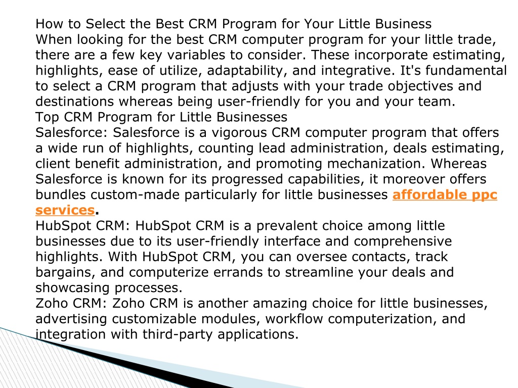 2. How to Select the Best CRM Program for Your Little Business When looking for the best CRM computer program for your little trade, there are a few key variables to consider. These incorporate estimating, highlights, ease of utilize, adaptability, and integrative. It's fundamental to select a CRM program that adjusts with your trade objectives and destinations whereas being user-friendly for you and your team. Top CRM Program for Little Businesses Salesforce: Salesforce is a vigorous CRM computer program that offers a wide run of highlights, counting lead administration, deals estimating, client benefit administration, and promoting mechanization. Whereas Salesforce is known for its progressed capabilities, it moreover offers bundles custom-made particularly for little businesses affordable ppc services. HubSpot CRM: HubSpot CRM is a prevalent choice among little businesses due to its user-friendly interface and comprehensive highlights. With HubSpot CRM, you can oversee contacts, track bargains, and computerize errands to streamline your deals and showcasing processes. Zoho CRM: Zoho CRM is another amazing choice for little businesses, advertising customizable modules, workflow computerization, and integration with third-party applications.