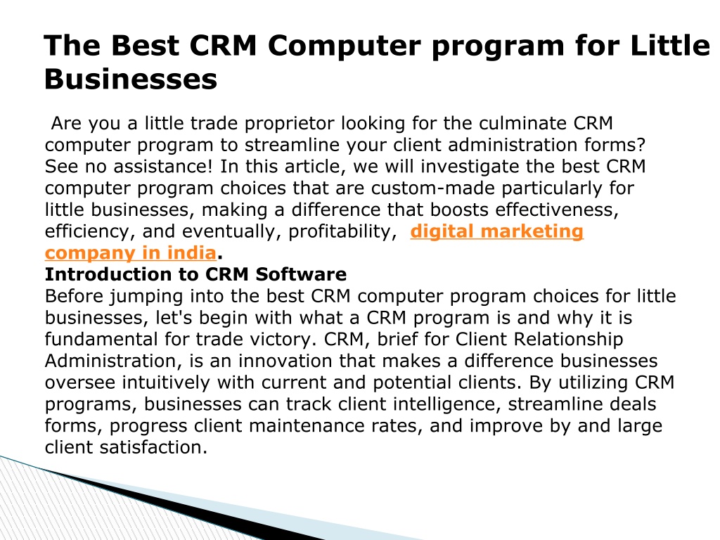 1. The Best CRM Computer program for Little Businesses Are you a little trade proprietor looking for the culminate CRM computer program to streamline your client administration forms? See no assistance! In this article, we will investigate the best CRM computer program choices that are custom-made particularly for little businesses, making a difference that boosts effectiveness, efficiency, and eventually, profitability, digital marketing company in india. Introduction to CRM Software Before jumping into the best CRM computer program choices for little businesses, let's begin with what a CRM program is and why it is fundamental for trade victory. CRM, brief for Client Relationship Administration, is an innovation that makes a difference businesses oversee intuitively with current and potential clients. By utilizing CRM programs, businesses can track client intelligence, streamline deals forms, progress client maintenance rates, and improve by and large client satisfaction.