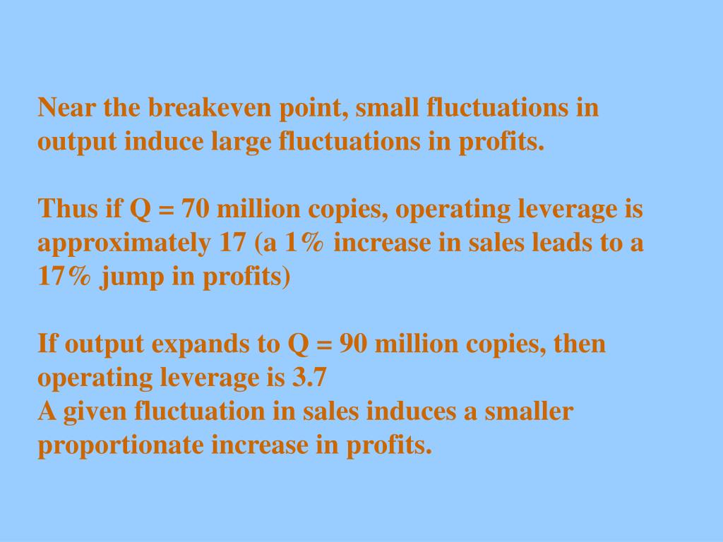 Near the breakeven point, small fluctuations in output induce large fluctuations in profits. Thus if Q = 70 million copies, operating leverage is approximately 17 (a 1% increase in sales leads to a 17% jump in profits) If output expands to Q = 90 million copies, then operating leverage is 3.7A given fluctuation in sales induces a smaller proportionate increase in profits.