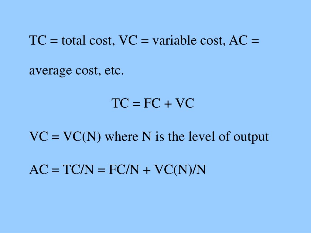 TC = total cost, VC = variable cost, AC = average cost, etc. TC = FC + VC VC = VC(N) where N is the level of output AC = TC/N = FC/N + VC(N)/N