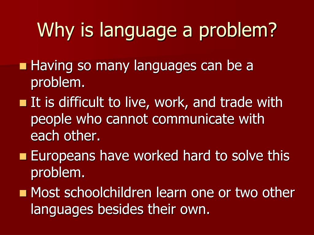 Why is language a problem? • Having so many languages can be a problem. • It is difficult to live, work, and trade with people who cannot communicate with each other. • Europeans have worked hard to solve this problem. • Most schoolchildren learn one or two other languages besides their own.