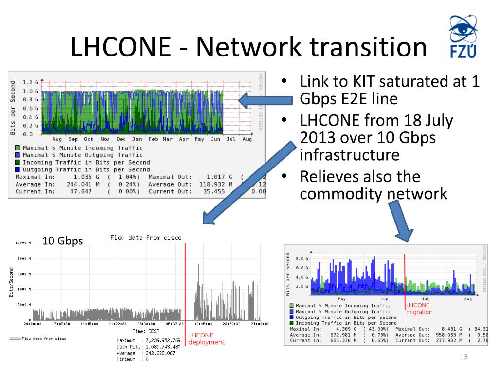 LHCONE - Network transition • Link to KIT saturated at 1 Gbps E2E line • LHCONE from 18 July 2013 over 10 Gbps infrastructure • Relieves also the commodity network 10 Gbps