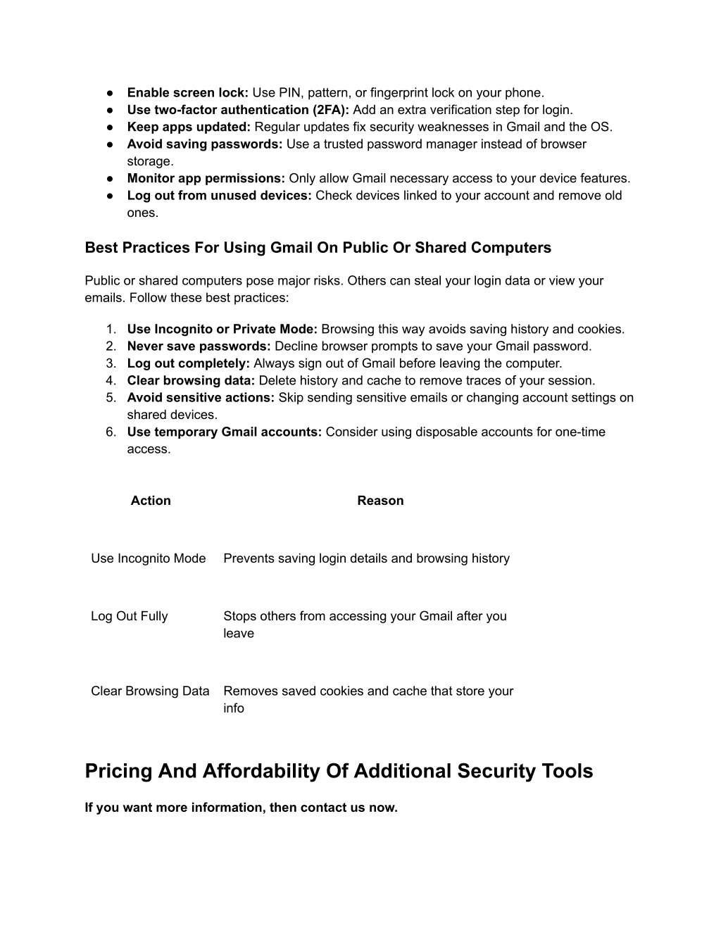 ● Enable screen lock: Use PIN, pattern, or fingerprint lock on your phone. ● Use two-factor authentication (2FA): Add an extra verification step for login. ● Keep apps updated: Regular updates fix security weaknesses in Gmail and the OS. ● Avoid saving passwords: Use a trusted password manager instead of browser storage. ● Monitor app permissions: Only allow Gmail necessary access to your device features. ● Log out from unused devices: Check devices linked to your account and remove old ones. Best Practices For Using Gmail On Public Or Shared Computers Public or shared computers pose major risks. Others can steal your login data or view your emails. Follow these best practices: 1. Use Incognito or Private Mode: Browsing this way avoids saving history and cookies. 2. Never save passwords: Decline browser prompts to save your Gmail password. 3. Log out completely: Always sign out of Gmail before leaving the computer. 4. Clear browsing data: Delete history and cache to remove traces of your session. 5. Avoid sensitive actions: Skip sending sensitive emails or changing account settings on shared devices. 6. Use temporary Gmail accounts: Consider using disposable accounts for one-time access. Action Reason Use Incognito Mode Prevents saving login details and browsing history Log Out Fully Stops others from accessing your Gmail after you leave Clear Browsing Data Removes saved cookies and cache that store your info Pricing And Affordability Of Additional Security Tools If you want more information, then contact us now.
