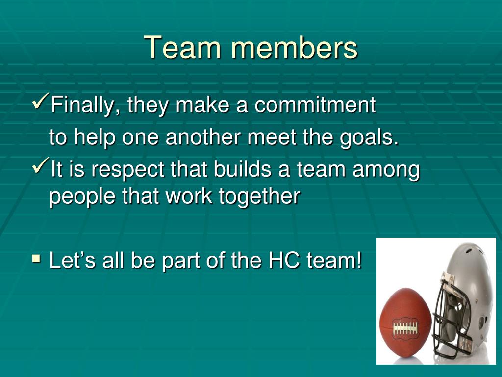 Team members • Finally, they make a commitment to help one another meet the goals. • It is respect that builds a team among people that work together • Let’s all be part of the HC team!