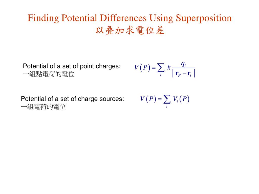 Finding Potential Differences Using Superposition以叠加求電位差 Potential of a set of point charges: 一組點電荷的電位 Potential of a set of charge sources: 一組電荷的電位