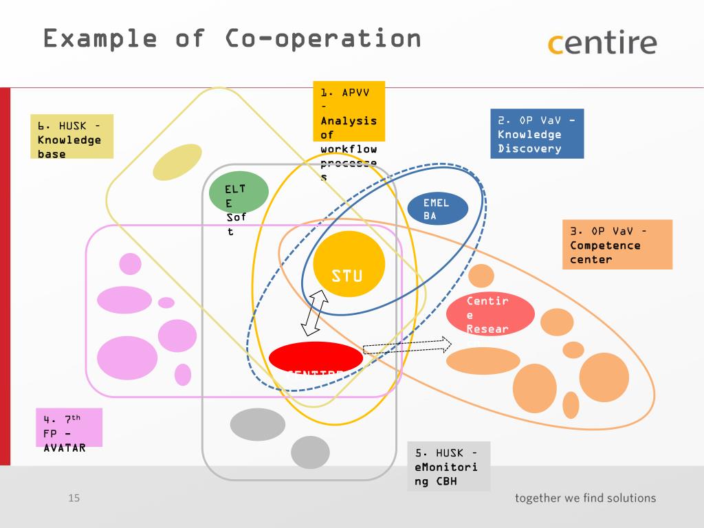 Example of Co-operation 1. APVV –Analysis ofworkflowprocesses 2. OP VaV -KnowledgeDiscovery 6. HUSK– Knowledge base ELTE Soft EMELBA 3. OP VaV –Competence center STU Centire Research CENTIRE 4. 7thFP -AVATAR 5. HUSK – eMonitoring CBH