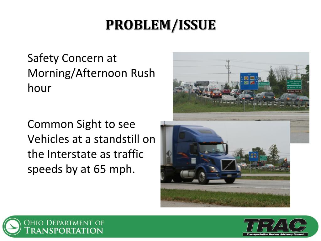 PROBLEM/ISSUE Safety Concern at Morning/Afternoon Rush hour Common Sight to see Vehicles at a standstill on the Interstate as traffic speeds by at 65 mph.