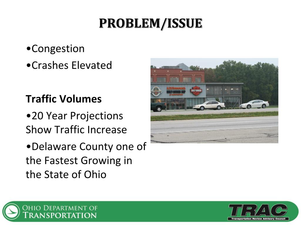 PROBLEM/ISSUE • Congestion • Crashes Elevated Traffic Volumes • 20 Year Projections Show Traffic Increase • Delaware County one of the Fastest Growing in the State of Ohio
