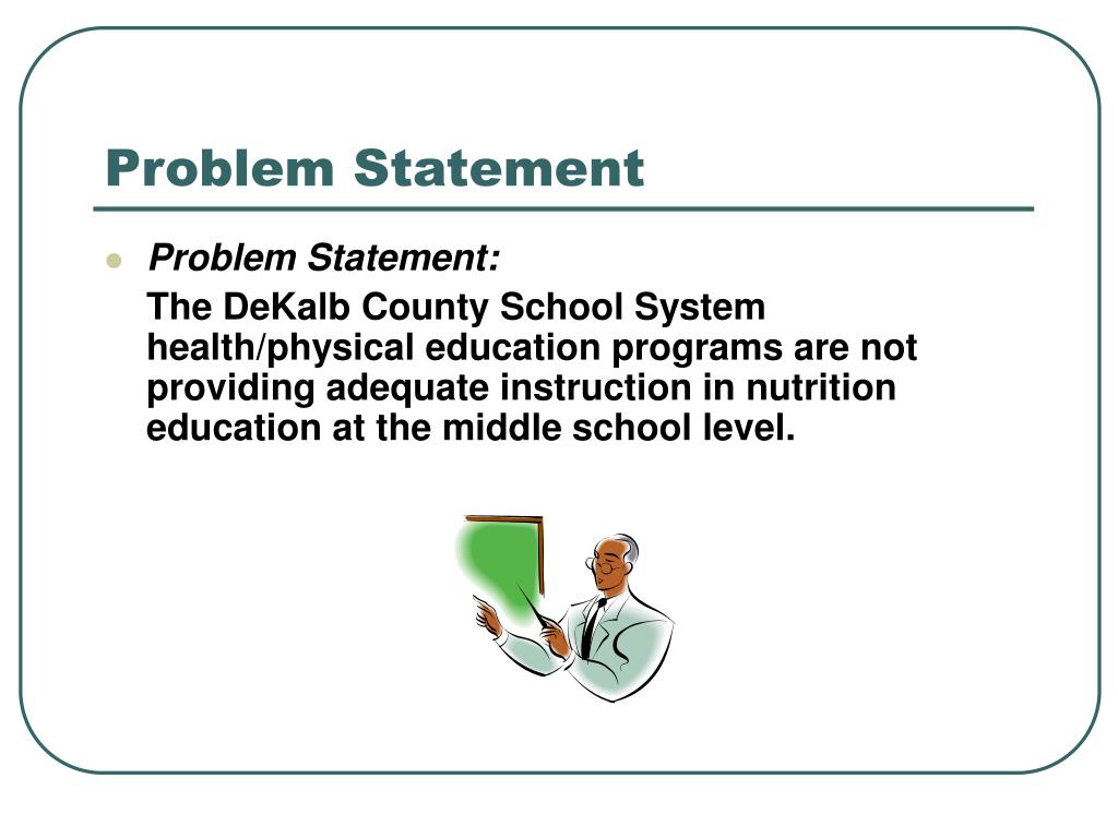 Problem Statement • Problem Statement: The DeKalb County School System health/physical education programs are not providing adequate instruction in nutrition education at the middle school level.