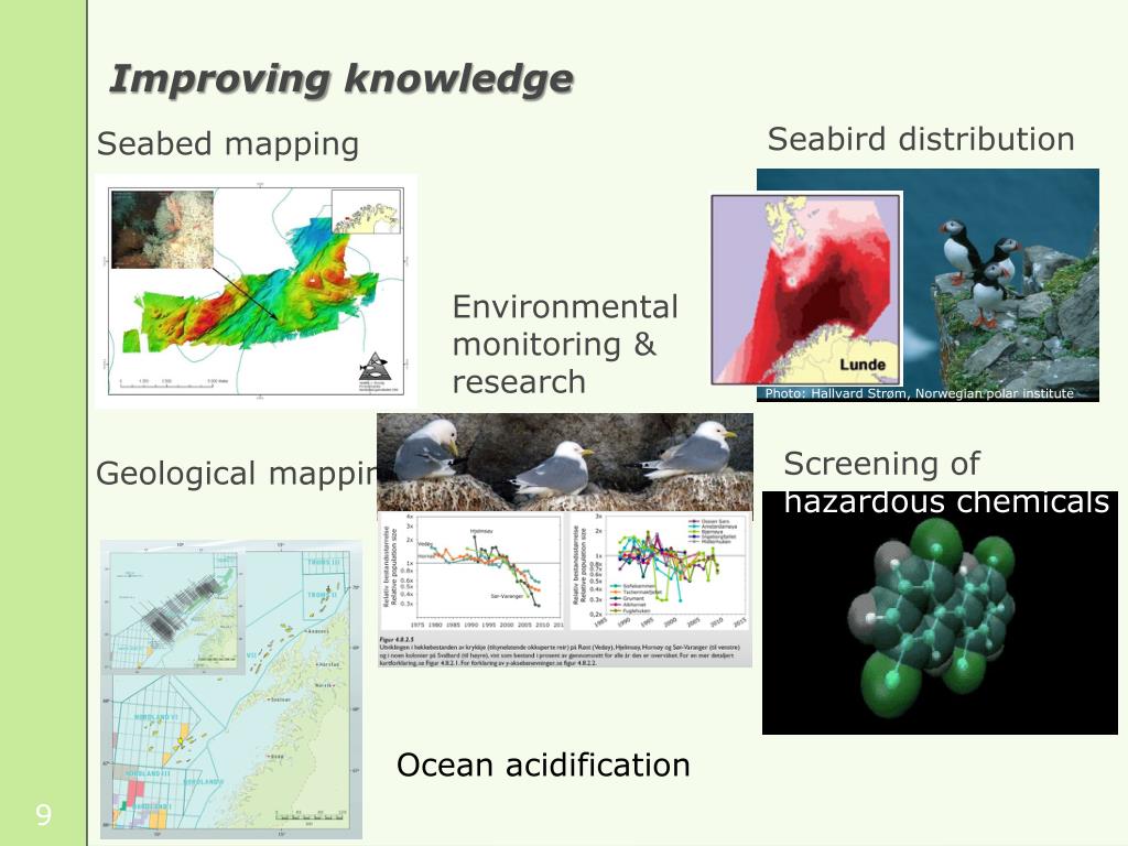 Improvingknowledge Seabirddistribution Seabedmapping Environmentalmonitoring & research Photo: Hallvard Strøm, Norwegian polar institute Screening of hazardouschemicals Geologicalmapping Ocean acidification