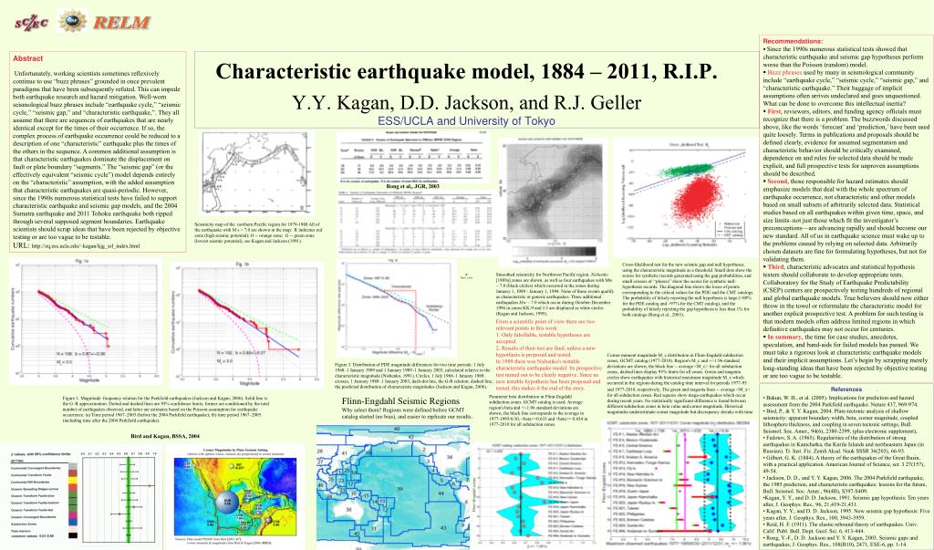 Recommendations: • Since the 1990s numerous statistical tests showed that characteristic earthquake and seismic gap hypotheses perform worse than the Poisson (random) model. • Buzz phrases used by many in seismological community include “earthquake cycle,” “seismic cycle,” “seismic gap,” and “characteristic earthquake.” Their baggage of implicit assumptions often arrives undeclared and goes unquestioned. What can be done to overcome this intellectual inertia? • First, reviewers, editors, and funding agency officials must recognize that there is a problem. The buzzwords discussed above, like the words ‘forecast’ and ‘prediction,’ have been used quite loosely. Terms in publications and proposals should be defined clearly, evidence for assumed segmentation and characteristic behavior should be critically examined, dependence on and rules for selected data should be made explicit, and full prospective tests for unproven assumptions should be described. • Second, those responsible for hazard estimates should emphasize models that deal with the whole spectrum of earthquake occurrence, not characteristic and other models based on small subsets of arbitrarily selected data. Statistical studies based on all earthquakes within given time, space, and size limits–not just those which fit the investigator’s preconceptions—are advancing rapidly and should become our new standard. All of us in earthquake science must wake up to the problems caused by relying on selected data. Arbitrarily chosen datasets are fine for formulating hypotheses, but not for validating them. • Third, characteristic advocates and statistical hypothesis testers should collaborate to develop appropriate tests. Collaboratory for the Study of Earthquake Predictability (CSEP) centers are prospectively testing hundreds of regional and global earthquake models. True believers should now either throw in the towel or reformulate the characteristic model for another explicit prospective test. A problem for such testing is that modern models often address limited regions in which definitive earthquakes may not occur for centuries. • In summary, the time for case studies, anecdotes, speculation, and band-aids for failed models has passed. We must take a rigorous look at characteristic earthquake models and their implicit assumptions. Let’s begin by scrapping merely long-standing ideas that have been rejected by objective testing or are too vague to be testable. Characteristic earthquake model, 1884 – 2011, R.I.P.Y.Y. Kagan, D.D. Jackson, and R.J. GellerESS/UCLA and University of Tokyo Abstract Unfortunately, working scientists sometimes reflexively continue to use “buzz phrases” grounded in once prevalent paradigms that have been subsequently refuted. This can impede both earthquake research and hazard mitigation. Well-worn seismological buzz phrases include “earthquake cycle,” “seismic cycle,” “seismic gap,” and “characteristic earthquake,”. They all assume that there are sequences of earthquakes that are nearly identical except for the times of their occurrence. If so, the complex process of earthquake occurrence could be reduced to a description of one “characteristic” earthquake plus the times of the others in the sequence. A common additional assumption is that characteristic earthquakes dominate the displacement on fault or plate boundary “segments.” The “seismic gap” (or the effectively equivalent “seismic cycle”) model depends entirely on the “characteristic” assumption, with the added assumption that characteristic earthquakes are quasi-periodic. However, since the 1990s numerous statistical tests have failed to support characteristic earthquake and seismic gap models, and the 2004 Sumatra earthquake and 2011 Tohoku earthquake both ripped through several supposed segment boundaries. Earthquake scientists should scrap ideas that have been rejected by objective testing or are too vague to be testable. URL: http://eq.ess.ucla.edu/~kagan/kjg_srl_index.html Rong et al,, JGR, 2003 Seismicity map of the northern Pacific region for 1979-1988 All of the earthquake with M s > 7.0 are shown in the map: R indicates red zone (high seismic potential); O -- orange zone; G -- green zone (lowest seismic potential), see Kagan and Jackson (1991). Cross-likelihood test for the new seismic gap and null hypotheses, using the characteristic magnitude as a threshold. Small dots show the scores for synthetic records generated using the gap probabilities, and small crosses of ‘‘plusses’’ show the scores for synthetic null-hypothesis records. The diagonal line shows the locus of points corresponding to the critical values for the PDE and the CMT catalogs. The probability of falsely rejecting the null hypothesis is large (>80% for the PDE catalog and >97% for the CMT catalog), and the probability of falsely rejecting the gap hypothesis is less than 1% for both catalogs (Rong et al., 2003). Smoothed seismicity for Northwest Pacific region. Nishenko [1989a] zones are shown, as well as four earthquakes with Mw ~ 7.0 (black circles) which occurred in the zones during January 1, 1989 - January 1, 1994. None of these events qualify as characteristic or generic earthquakes. Three additional earthquakes Mw ~ 7.0 which occur during October-December 1994 in zones KK-9 and J-3 are displayed as white circles (Kagan and Jackson, 1995). From a scientific point of view there are two relevant points in this work: 1. Only falsifiable, testable hypotheses are accepted. 2. Results of their test are final, unless a new hypothesis is proposed and tested. In 1989 there was Nishenko's testable characteristic earthquake model. Its prospective test turned out to be clearly negative. Since no new testable hypothesis has been proposed and tested, this makes it the end of the story. Corner moment magnitude M_c distribution in Flinn-Engdahl subduction zones, GCMT catalog (1977-2010). Region's 