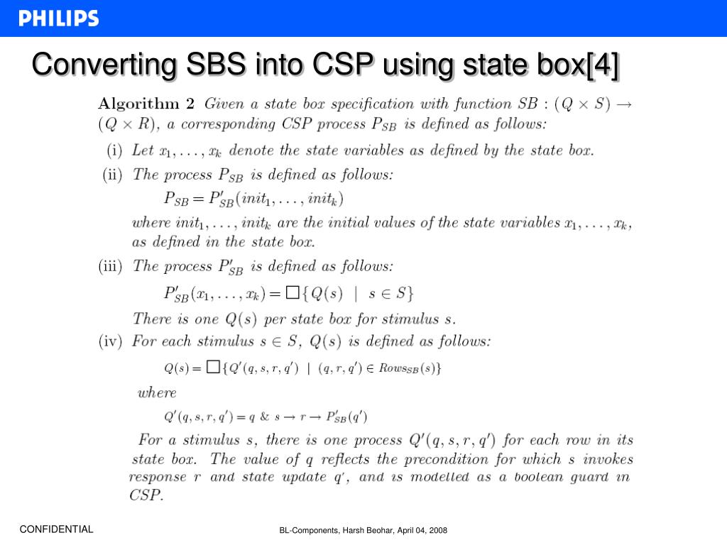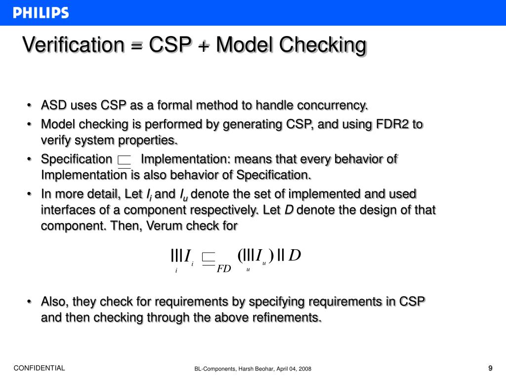 Verification = CSP + Model Checking • ASD uses CSP as a formal method to handle concurrency. • Model checking is performed by generating CSP, and using FDR2 to verify system properties. • Specification Implementation: means that every behavior of Implementation is also behavior of Specification. • In more detail, Let Ii and Iudenote the set of implemented and used interfaces of a component respectively. Let D denote the design of that component. Then, Verum check for • Also, they check for requirements by specifying requirements in CSP and then checking through the above refinements.