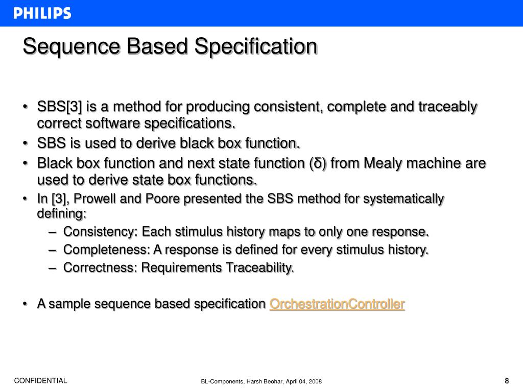 Sequence Based Specification • SBS[3] is a method for producing consistent, complete and traceably correct software specifications. • SBS is used to derive black box function. • Black box function and next state function (δ) from Mealy machine are used to derive state box functions. • In [3], Prowell and Poore presented the SBS method for systematically defining: • Consistency: Each stimulus history maps to only one response. • Completeness: A response is defined for every stimulus history. • Correctness: Requirements Traceability. • A sample sequence based specification OrchestrationController