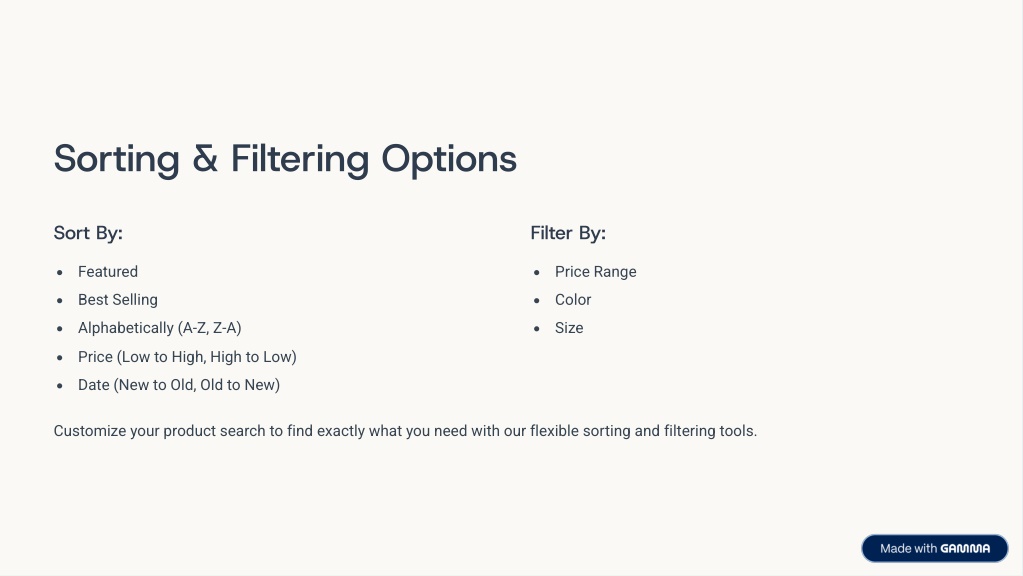 Sorting & Filtering Options Sort By: Filter By: Featured Price Range Best Selling Color Alphabetically (A-Z, Z-A) Size Price (Low to High, High to Low) Date (New to Old, Old to New) Customize your product search to find exactly what you need with our flexible sorting and filtering tools.