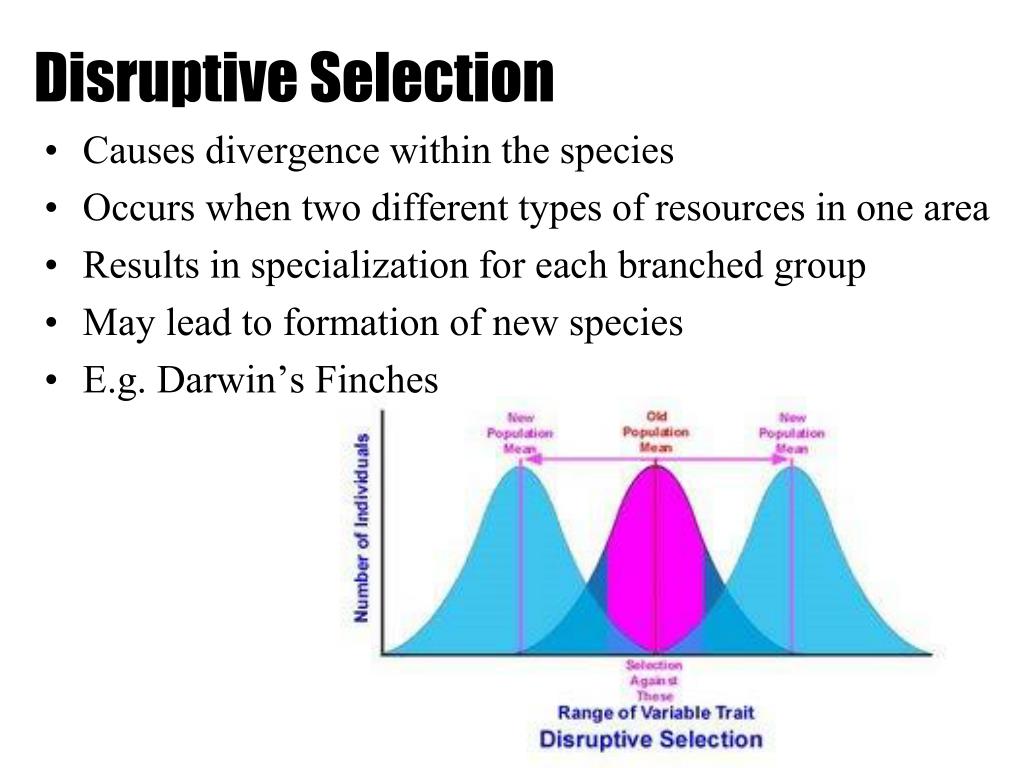 Disruptive Selection Causes divergence within the species Occurs when two different types of resources in one area Results in specialization for each branched group May lead to formation of new species E.g. Darwin’s Finches