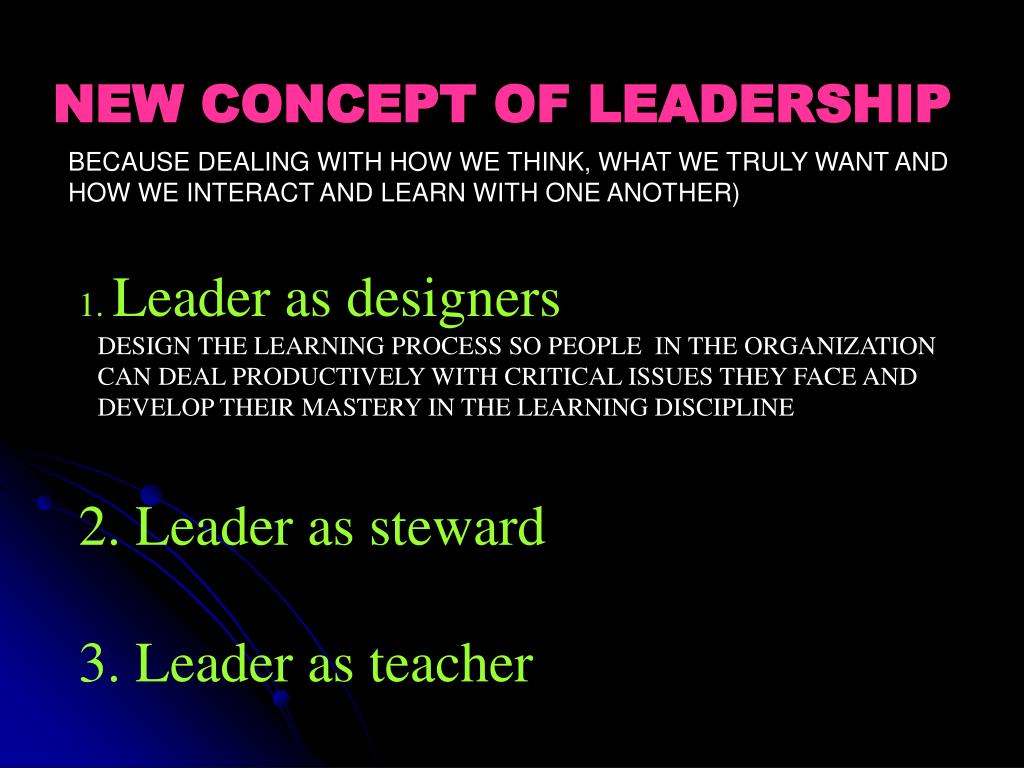 NEW CONCEPT OF LEADERSHIP BECAUSE DEALING WITH HOW WE THINK, WHAT WE TRULY WANT AND HOW WE INTERACT AND LEARN WITH ONE ANOTHER) 1. Leader as designers DESIGN THE LEARNING PROCESS SO PEOPLE IN THE ORGANIZATION CAN DEAL PRODUCTIVELY WITH CRITICAL ISSUES THEY FACE AND DEVELOP THEIR MASTERY IN THE LEARNING DISCIPLINE 2. Leader as steward 3. Leader as teacher
