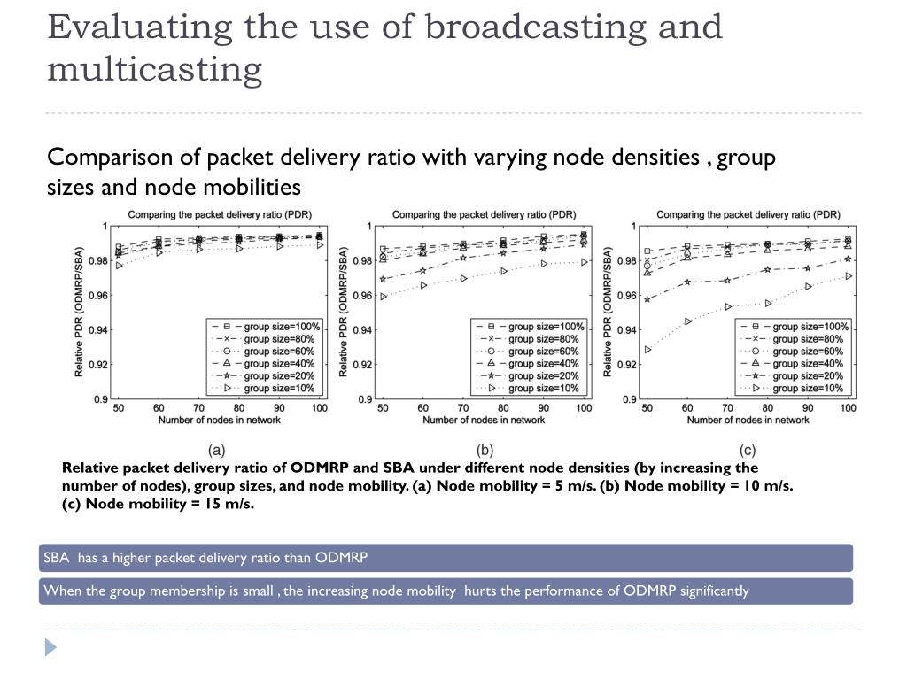 Evaluating the use of broadcasting and multicasting Comparison of packet delivery ratio with varying node densities , group sizes and node mobilities Relative packet delivery ratio of ODMRP and SBA under different node densities (by increasing the number of nodes), group sizes, and node mobility. (a) Node mobility = 5 m/s. (b) Node mobility = 10 m/s. (c) Node mobility = 15 m/s.