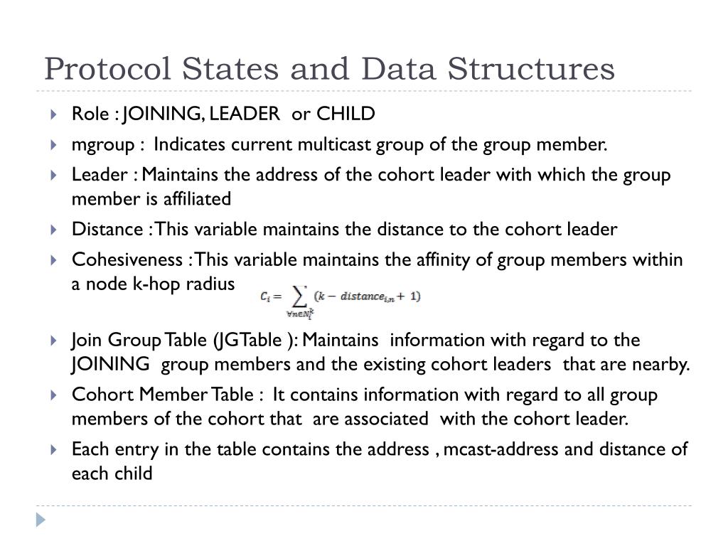 Protocol States and Data Structures • Role : JOINING, LEADER or CHILD • mgroup : Indicates current multicast group of the group member. • Leader : Maintains the address of the cohort leader with which the group member is affiliated • Distance : This variable maintains the distance to the cohort leader • Cohesiveness : This variable maintains the affinity of group members within a node k-hop radius • Join Group Table (JGTable ): Maintains information with regard to the JOINING group members and the existing cohort leaders that are nearby. • Cohort Member Table : It contains information with regard to all group members of the cohort that are associated with the cohort leader. • Each entry in the table contains the address , mcast-address and distance of each child