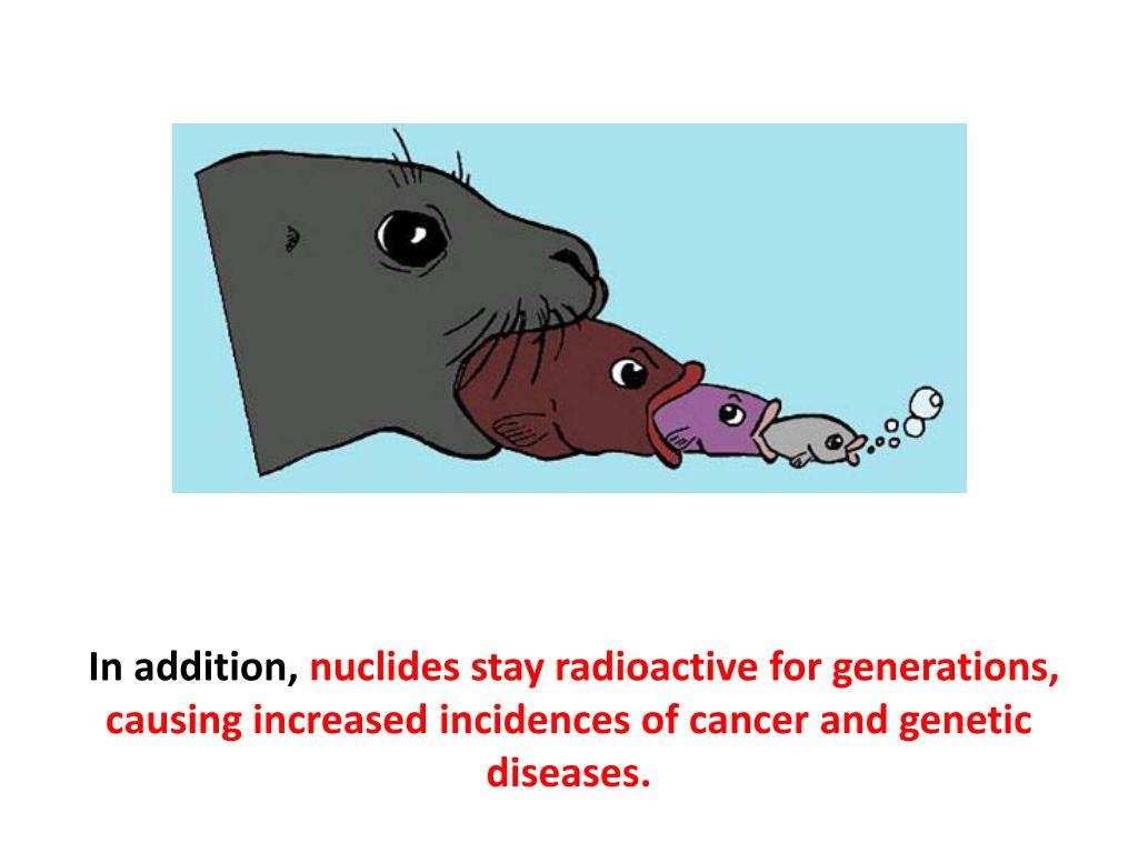 In addition, nuclides stay radioactive for generations, causing increased incidences of cancer and genetic diseases.